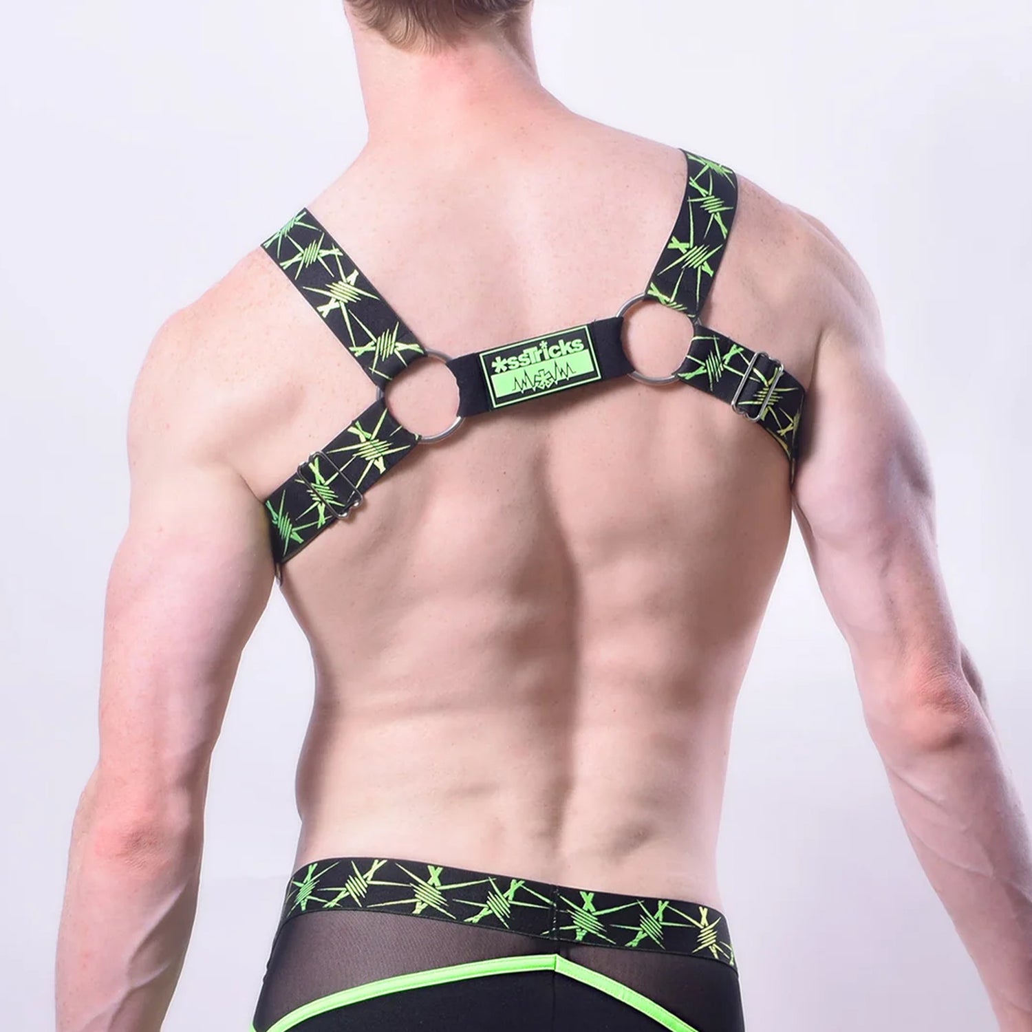 The AssTricks Stinger Harness Neon Green is built to cut a sharp silhouette, wrapping the chest in aggressive graphic lines that feel clean, industrial, and impossible to ignore. The barbed-style elastic creates a striking frame, while satin jacquard straps add a dark, refined edge that balances raw intensity with a polished finish.