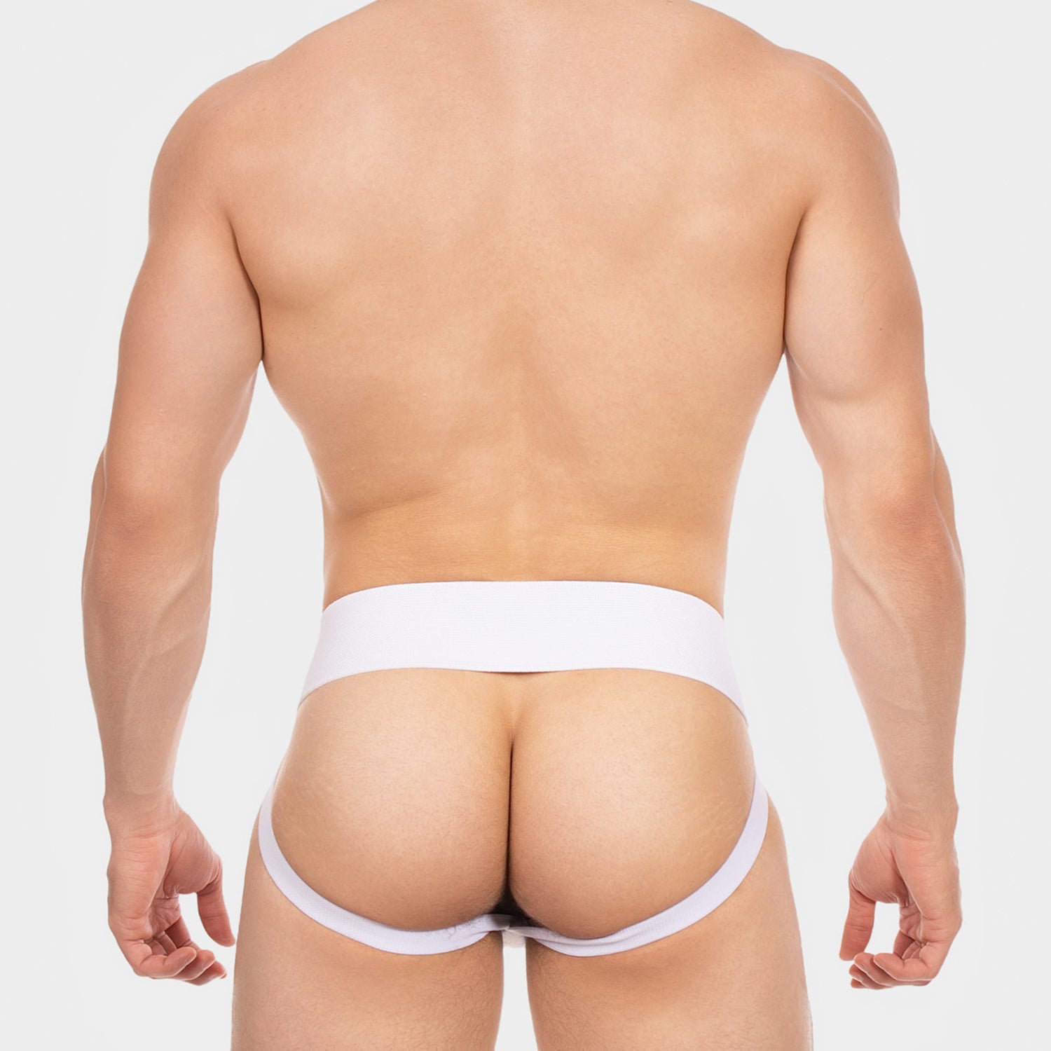 Barcode Berlin Jockstrap Rokk White Royal Serves a flaunting style with confident support. Featuring a wide elastic waistband with a sleek silicone logo, it frames the waist with a strong masc edge. The ribbed, contoured pouch with reinforced stitching enhances shape and comfort, while visible snap fasteners add a daring, functional detail. Leg straps secure the fit, making this piece both provocative and practical for an irresistible vintage-esque look.