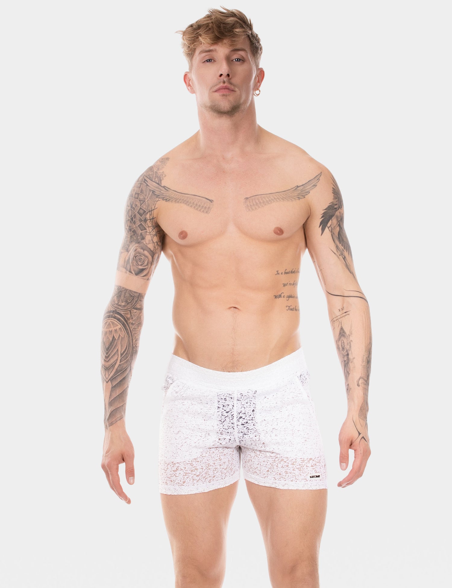 The Barcode Berlin Short Lincon White features a fitted silhouette with a striking blend of opaque and sheer lace panels, creating a bold and sexy look. Designed to sit low on the waist, these shorts offer a snug, form-enhancing fit. A discreet branded tag on the front left leg adds a subtle touch of authenticity. Perfect for those seeking a daring yet stylish piece, these shorts combine provocative design with expert tailoring.