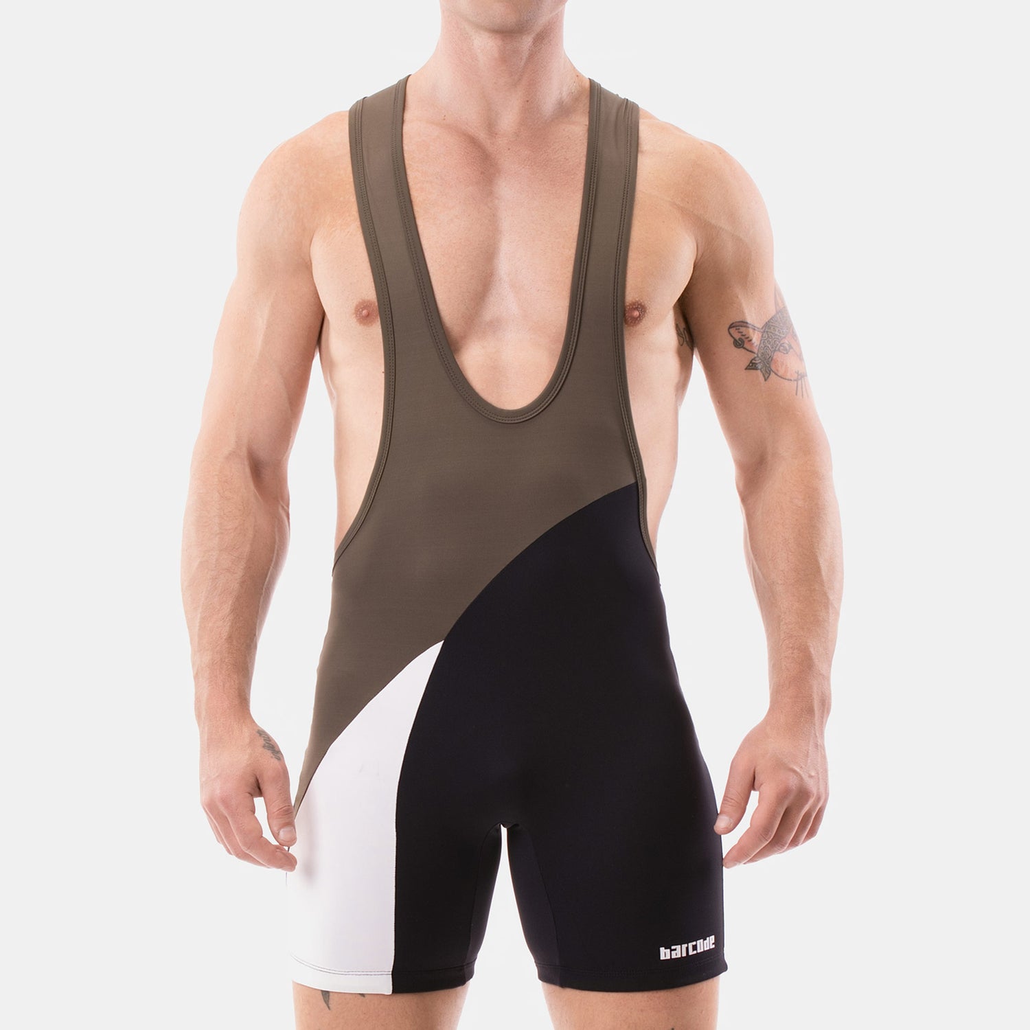 The ever-popular Barcode Berlin Singlet Luckenwalde Dark Army White Black is a striking abstract designer one-piece (no zips or cut-outs) wrestling singlet. The three bright colour contrasts on this sleek sexy lightweight piece of sports gear keeps you cool when things are getting hot.