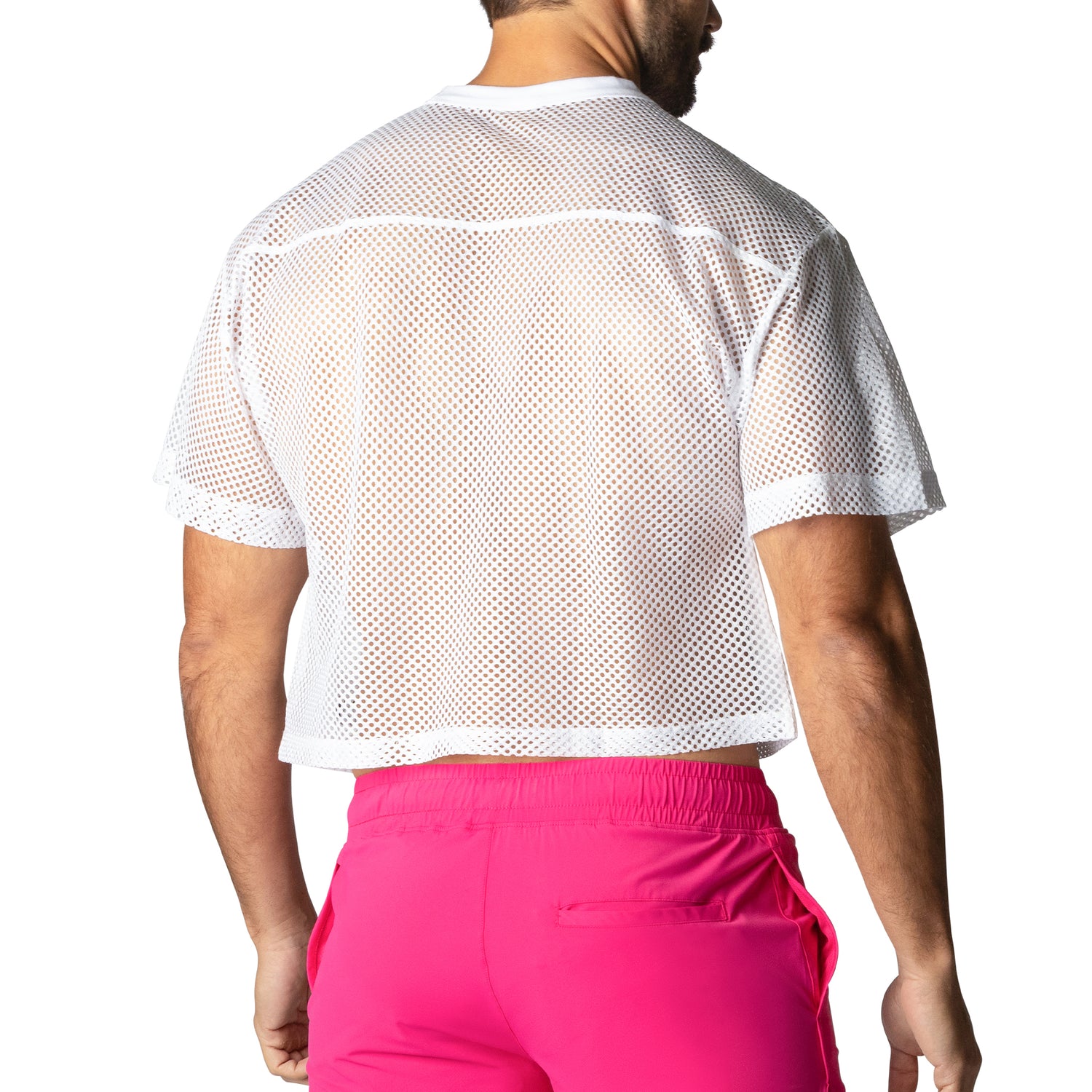 Made of semi transparent mesh for a soft fetish look in an athletic cut, this distinctive jersey design brings you the best of both worlds. Tasteful seams across the chest and around the collar finish this shirt in vintage locker room style, while the tease of your body underneath the light, breathable fabric hints at your naughty side.