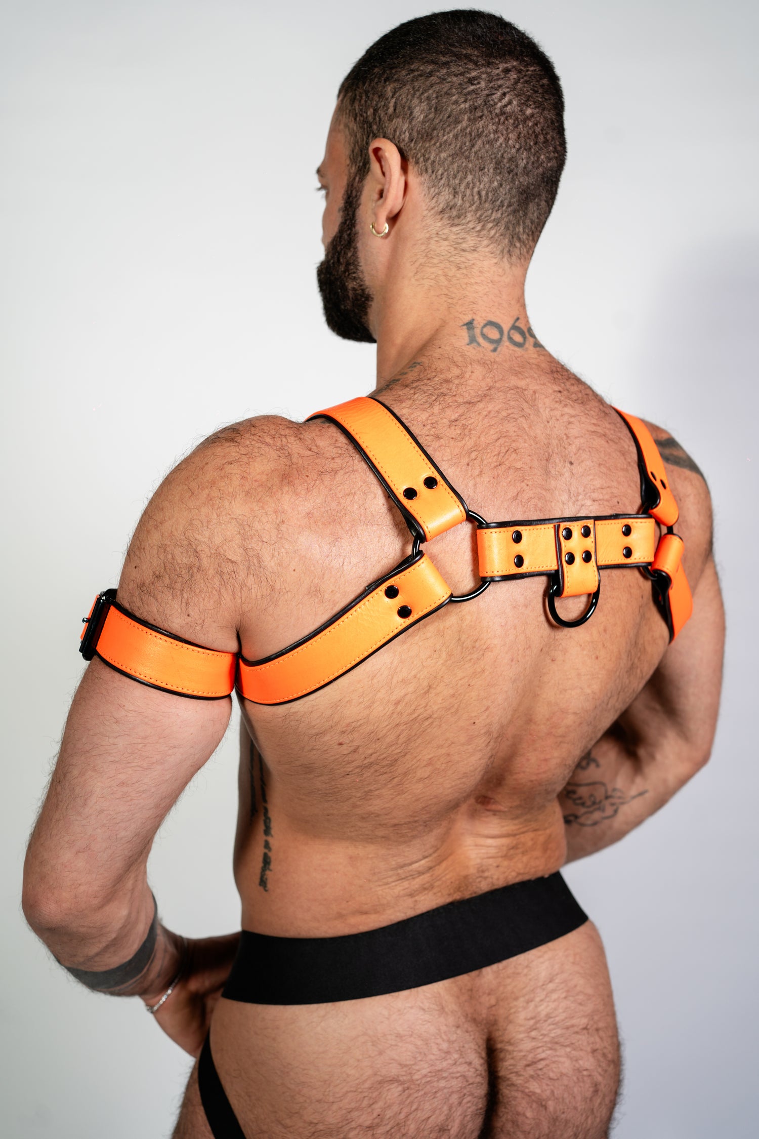 Crafted from 100% premium calf leather, the all-new ruff GEAR Bold Leather Bulldog Harness Neon Orange provides a very visible signal to all admirers! Bright, unmissable coloured leather gives the strongest signal yet of what you are into, and what you're after! Add in exceptional softness, comfort, and long-lasting durability, and you've a harness that works for you in more ways than one.
