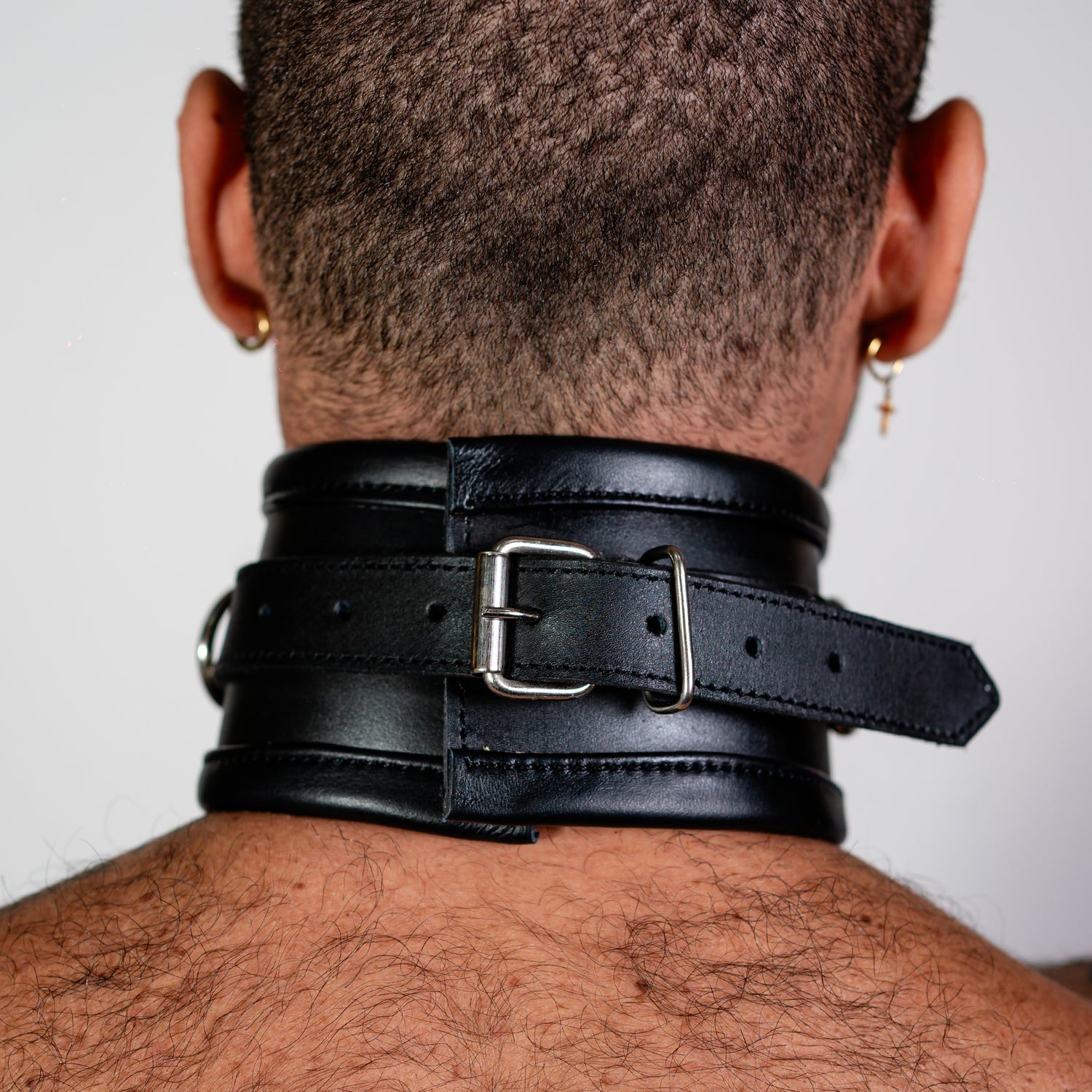Show off your ownership with a ruff GEAR Hardcore Leather Collar. The sexy stylish padded collar offers the wearer comfort for extended play, and the steel studded leather strap ensures he holds his neck high. Complete with 3 steel D-rings for leash control, and even multiple leashes or additional cuff attachments means this collar can be used in tandem with other ruff GEAR Hardcore products, but only if he's been a good boy!