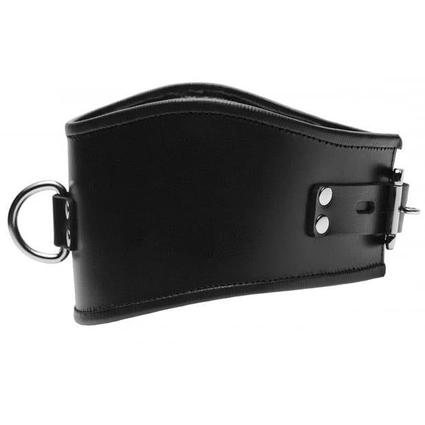 Hold your head high with the ruff GEAR Hardcore Leather Posture Collar and keep your chin up. Enjoy an ever more obedient partner as you restrict neck movement and train them up. Padded on the inside and a smooth high quality leather finish on the exterior, it's all about style and aesthetic, and a simple smart leash ring is held in place by four symmetric steel studs on the centre front. Fastened at the rear with a high quality leather strap and round-head pin buckle.