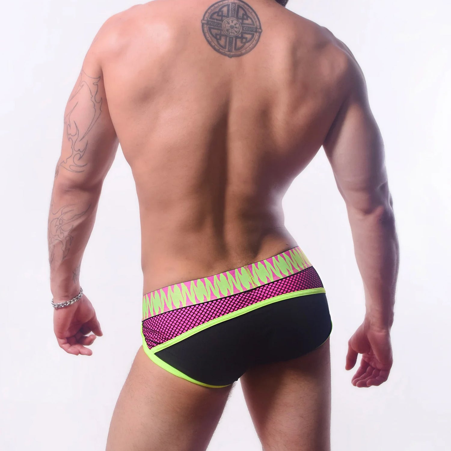 The AssTricks Rough House Brief Neon Pink Green brings a punk-charged edge to classic underwear, blending bold color contrast with a confrontational, club-ready aesthetic. The standout ransom-style logo sets the tone, while layered stretch elastic and fishnet fabric create depth, texture, and a deliberately raw look that feels rebellious rather than decorative.