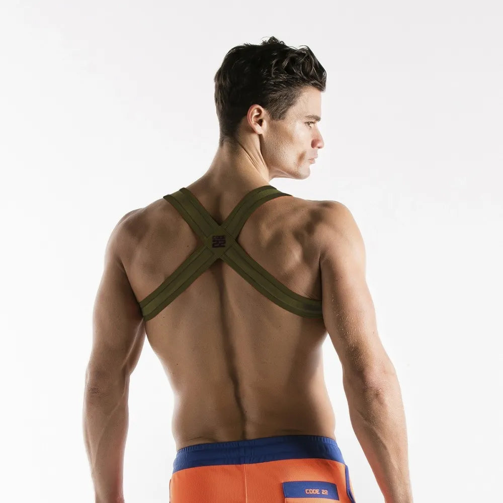 The Code 22 Sport Harness Khaki is a wide strap fabric harness with cross back. Perfect for military and sport fetish looks and made from high quality materials, this harness is made to last. Contrasting piping and silicone Code 22 logo badge create this a striking sporty fetish look. Team it up with your favourite shorts or a jockstrap for a full on sport fetish feel.