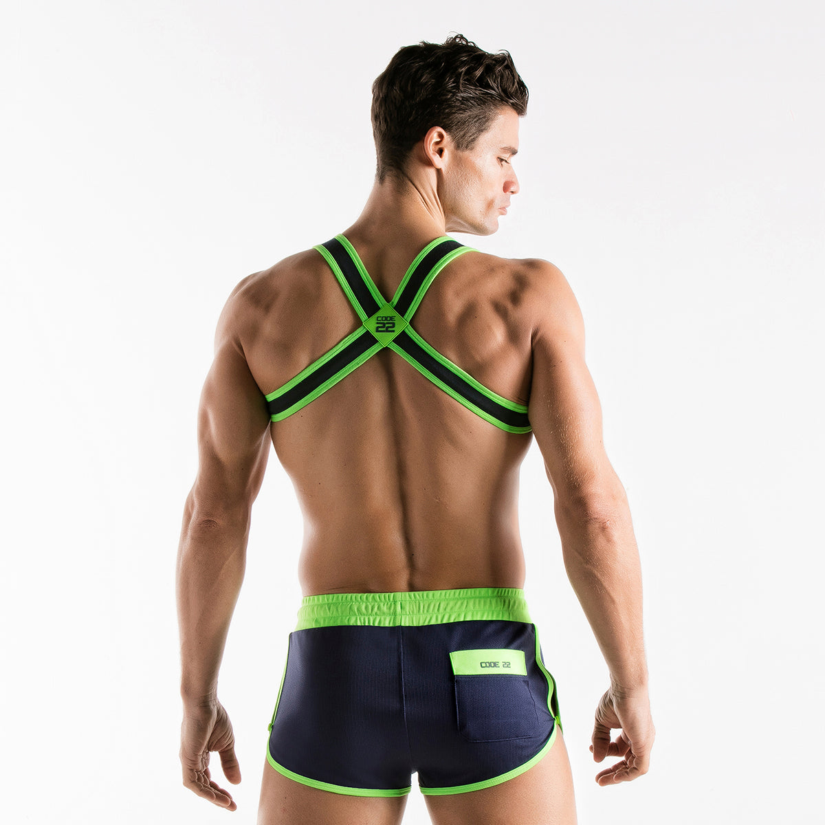 Contrasting lime green piping and silicone Code 22 logo badge create this a striking sporty fetish look. Team it up with your favourite shorts or a jockstrap for a full on sport fetish feel.