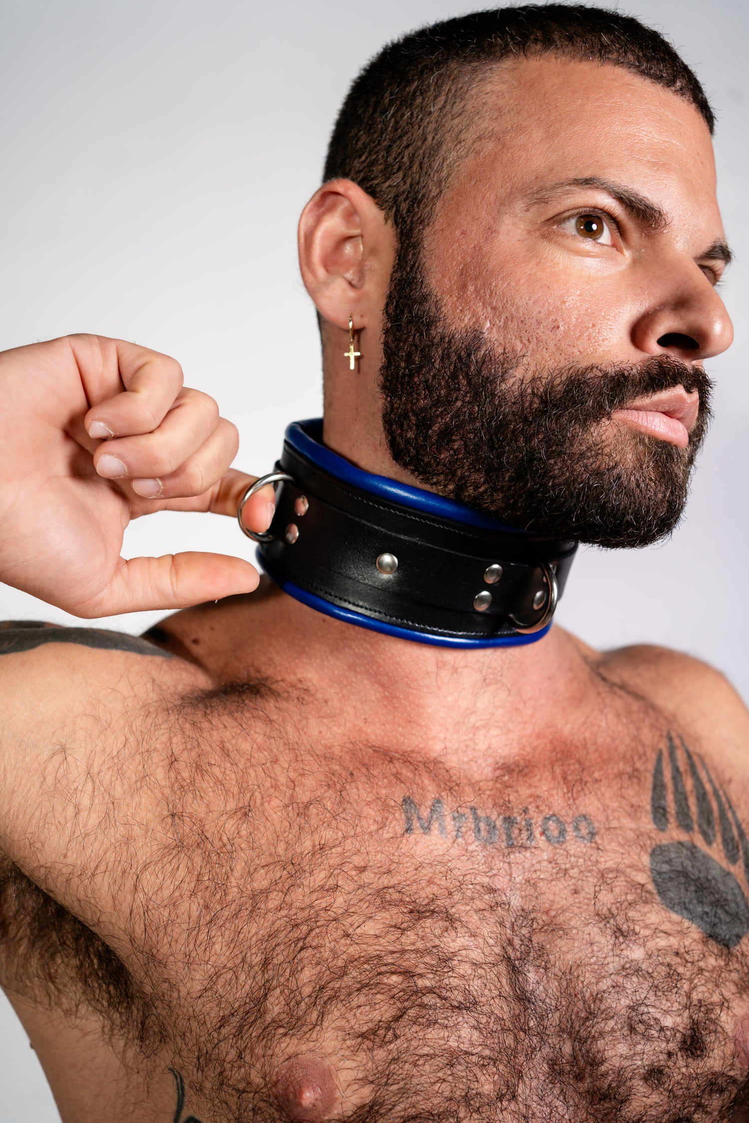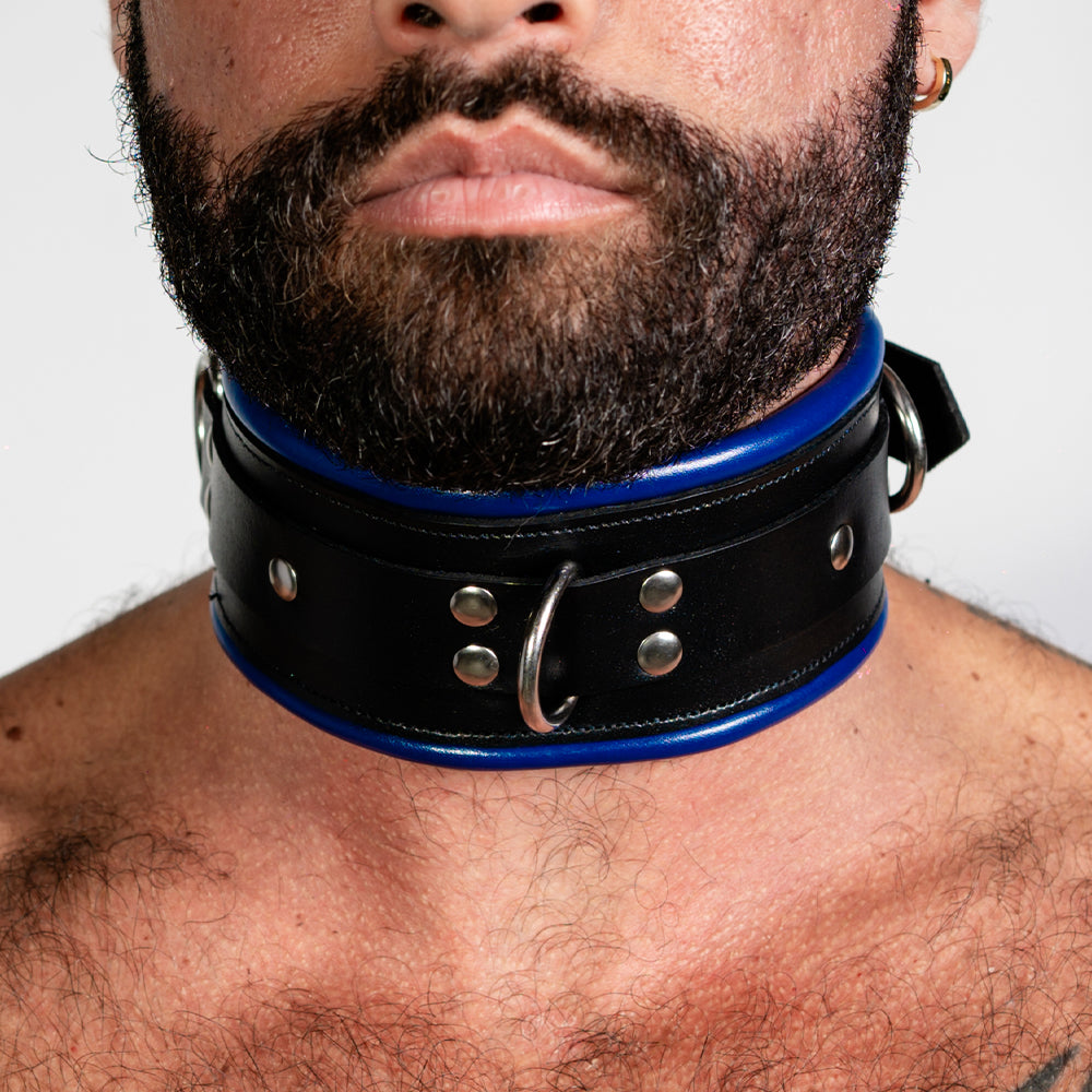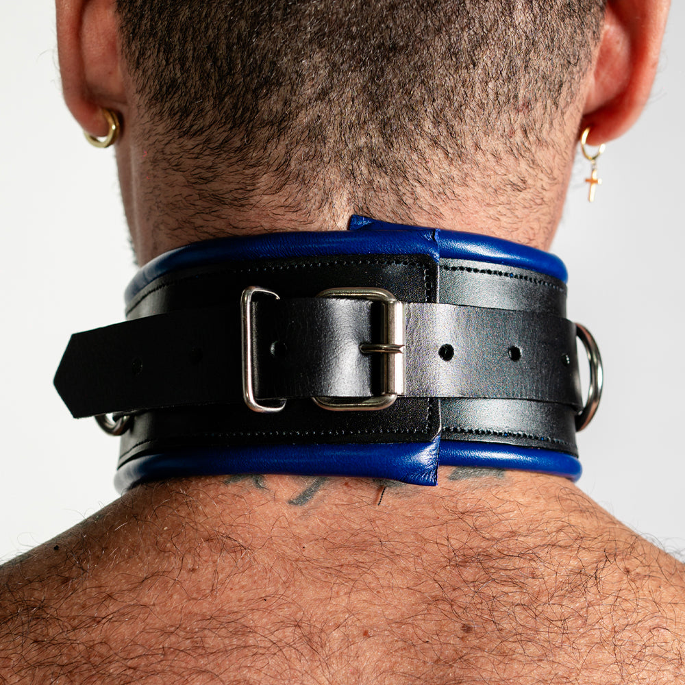 Declare your ownership with the ruff GEAR Leather Padded Neck Collar in Blue. This sleek, padded collar provides lasting comfort during extended play, while the steel-studded leather strap keeps the wearer confidently upright. It features three integrated D-rings for leash control or attaching your preferred fetish gear. This collar is also offered in a bold Red shade.
