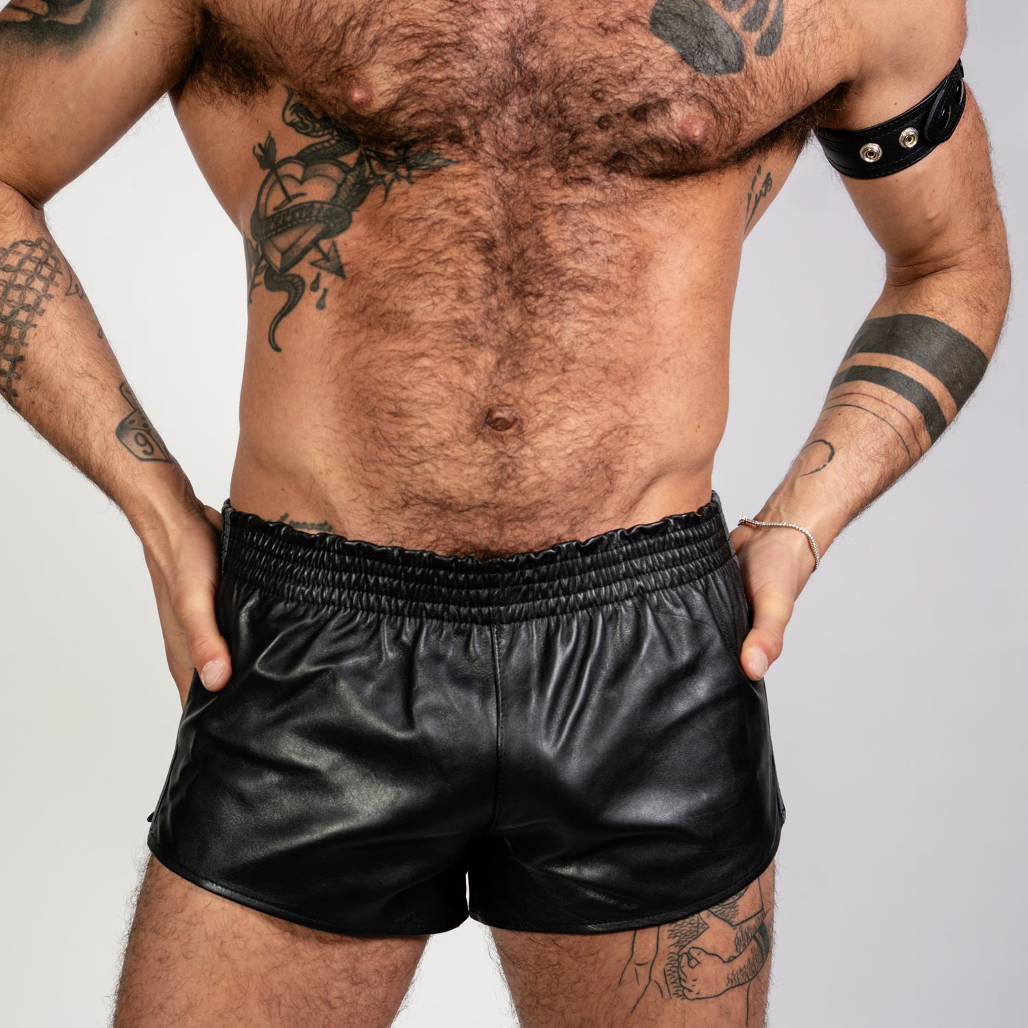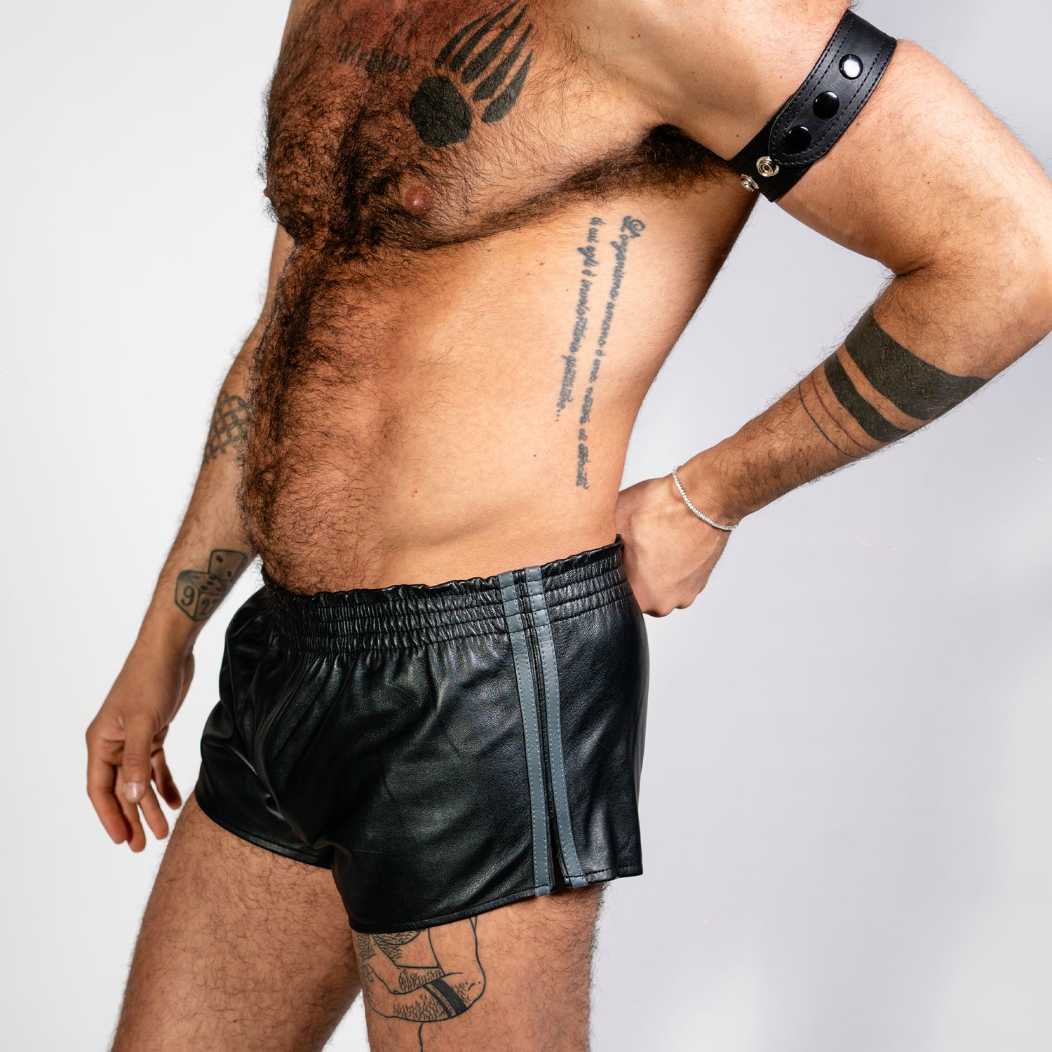 The sporty side cut adds a unique touch to your leather gear, proving leather kink isn't all serious, it's about fun and comfort, as much as the feel and smell of leather against skin!