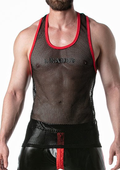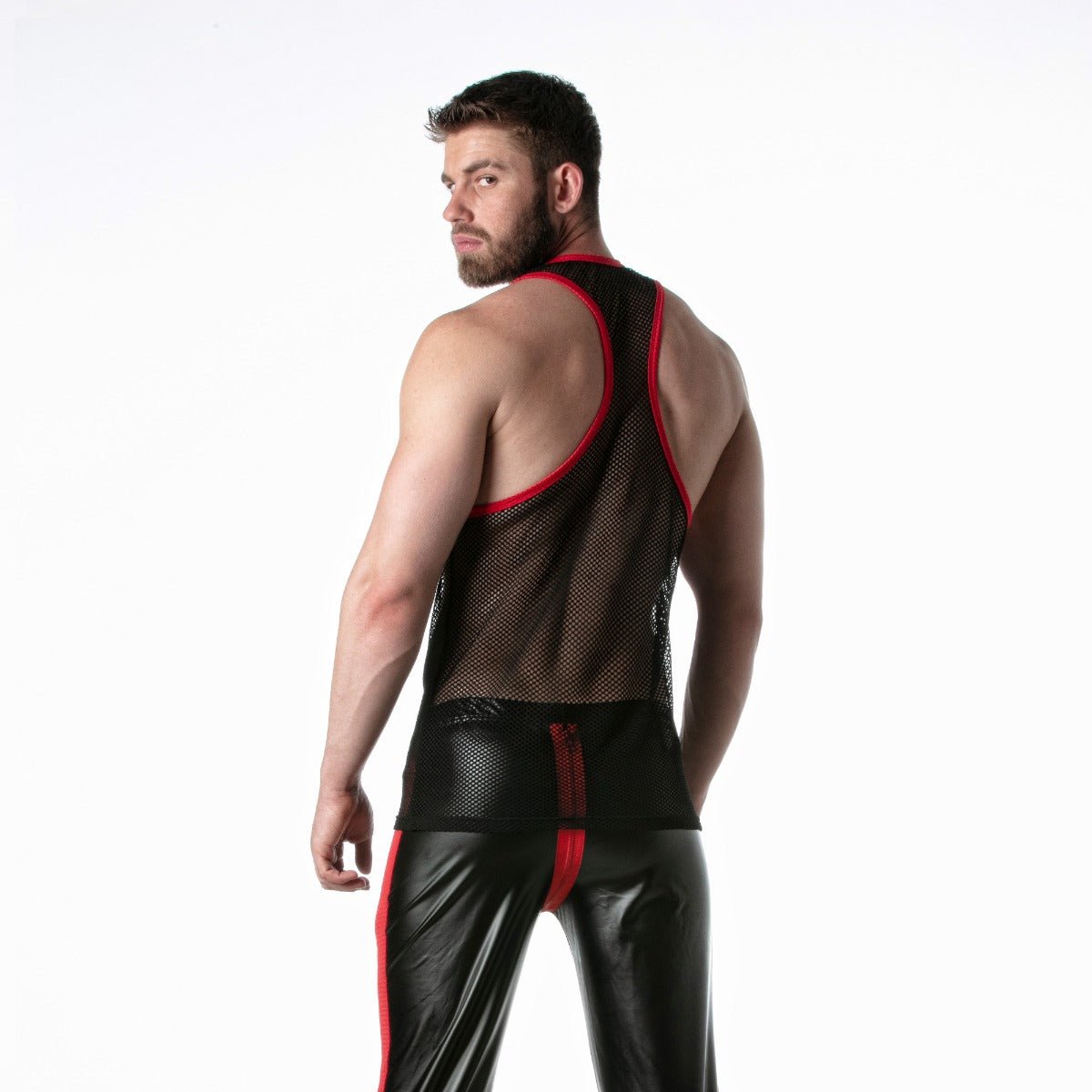 Made from comfy, transparent mesh fibre, the Leader Mesh Tank Top Red boasts a strong fetish look. The racer back design and solid trim finish in your favourite fetish code colour defines a masculine fit.