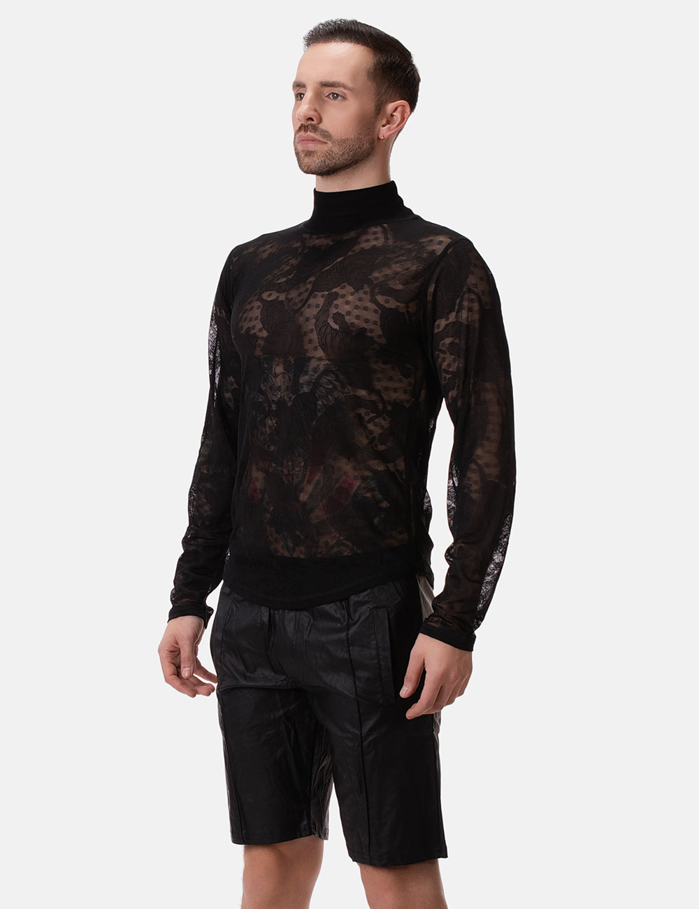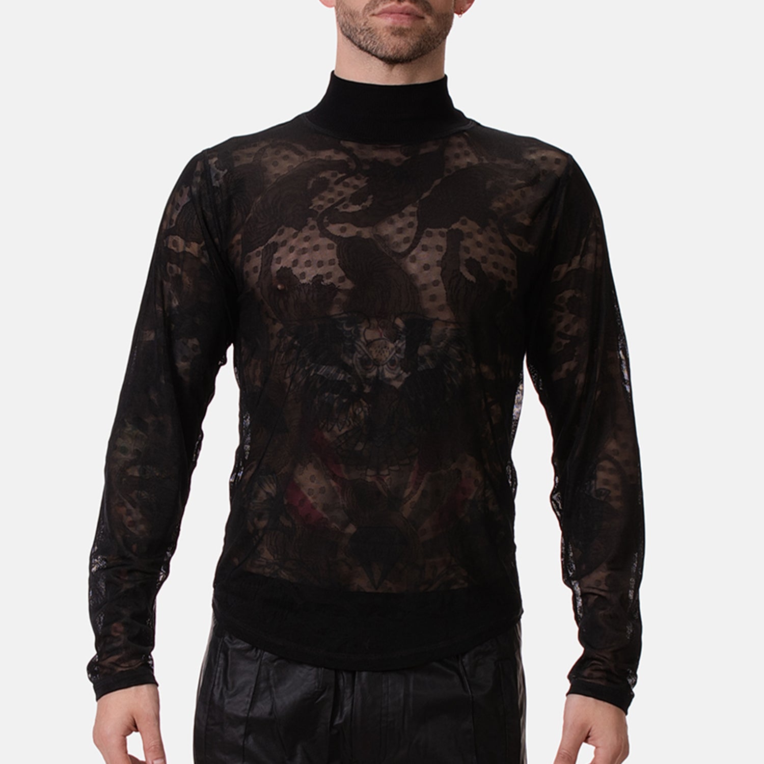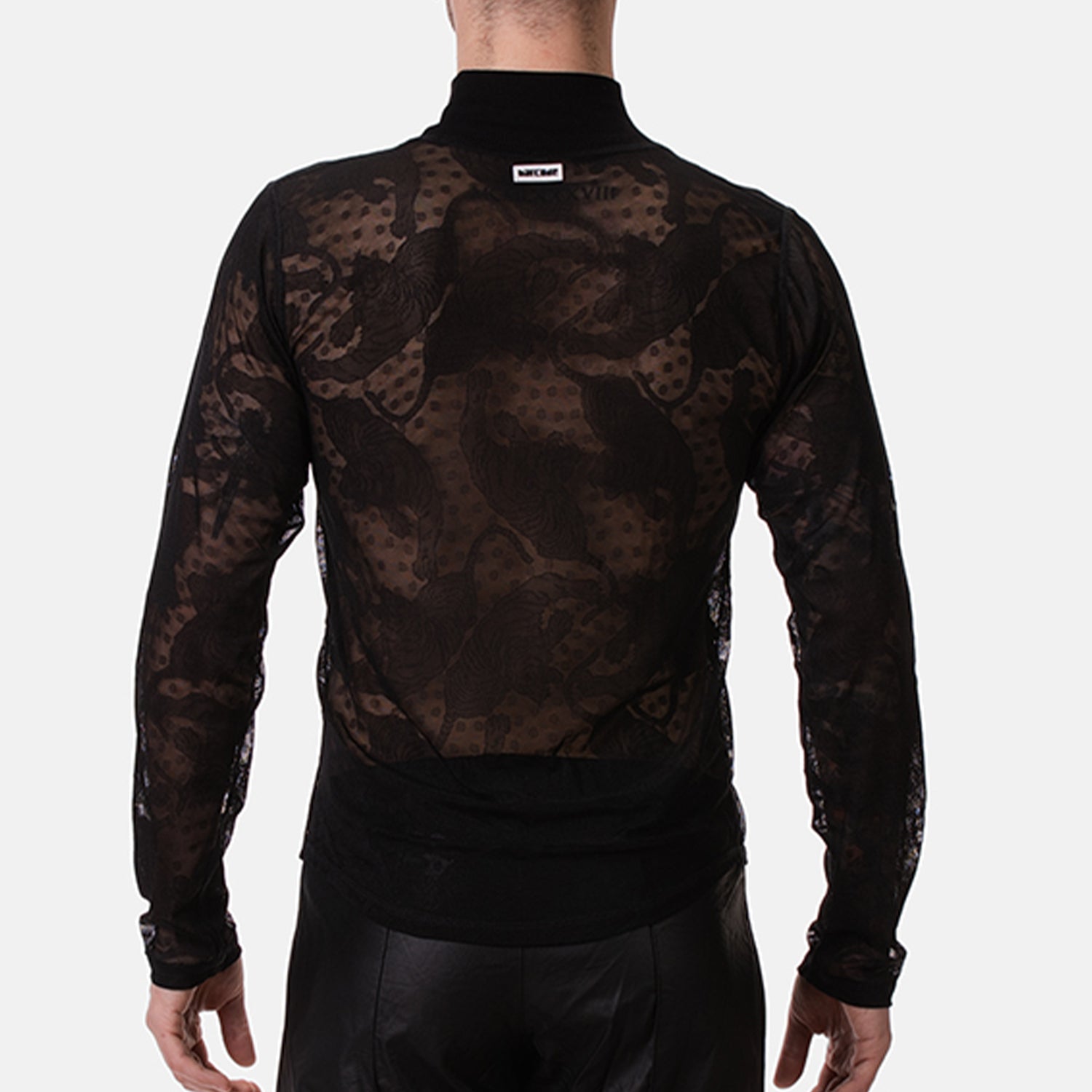 Elevate your style with the Barcode Berlin Turtle Neck Mete Black. Made with delicate black mesh, this sheer turtleneck subtly reveals while keeping just enough to the imagination, perfect for those who love to tease. Its sleek design effortlessly combines boldness with sophistication, making it a statement piece for any wardrobe.