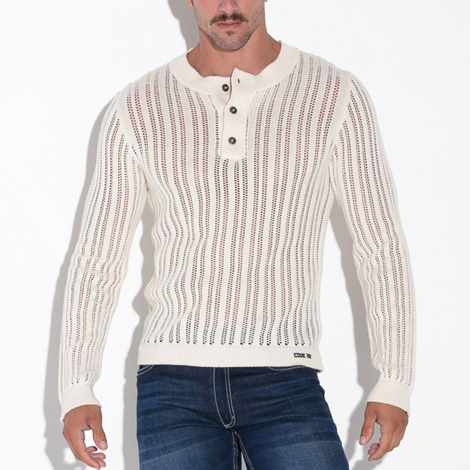 Get a soft, sexy fetish look in the Code 22 Knitted Stripe Henley Sweater Off White! This classic cut gets an elegantly kinky reboot with semi-transparent knitted fabric in a flattering fit.
