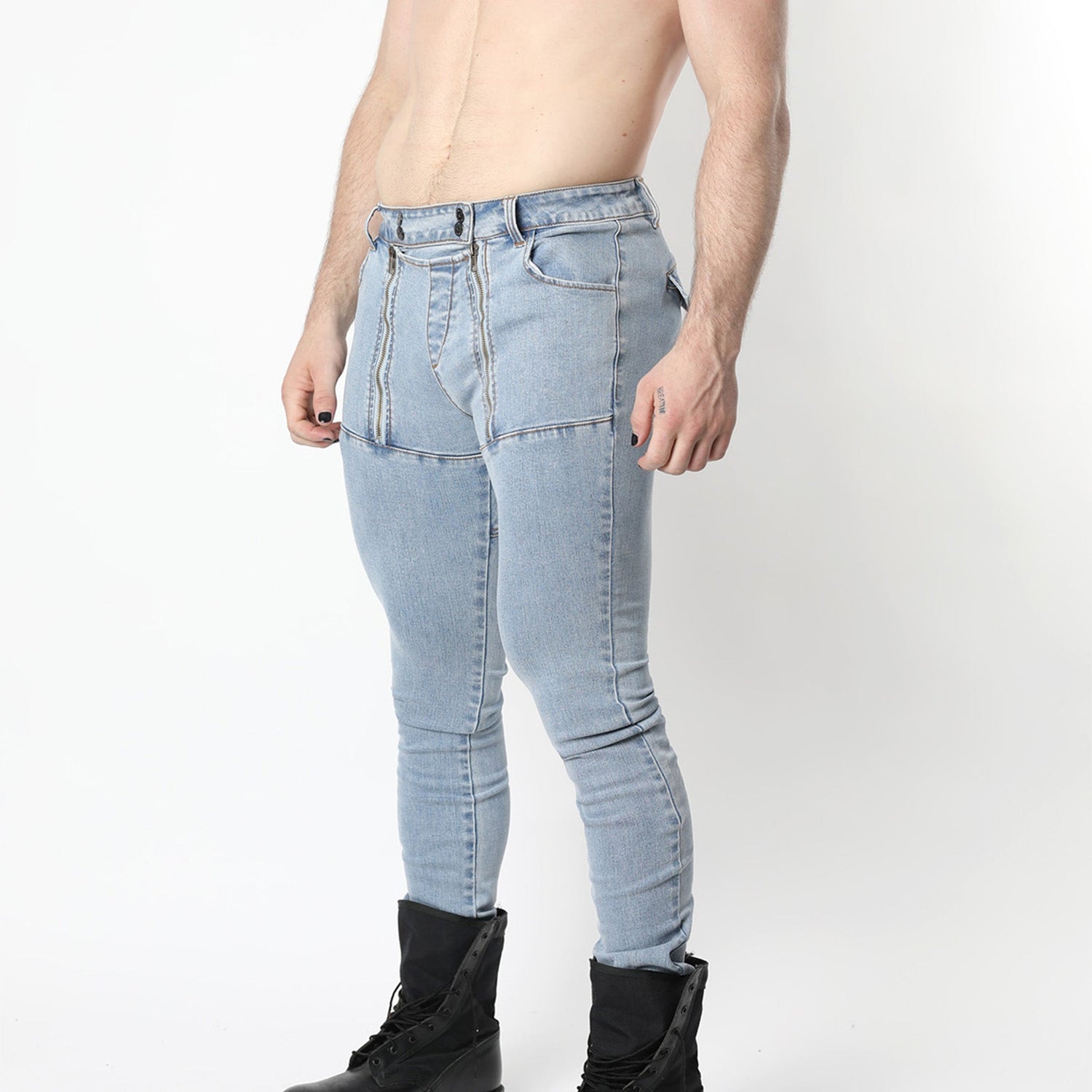 Cut in a flattering slim fit, the zipper pant is available in three versatile washes to express your individual style. Comfortable, stretchy denim fabric moulds itself around you to perfectly combine functionality and fashion. Two hand pockets with an inside coin pocket give you storage space for your poppers and toys, and the back pockets with flap closure detail draw the eyes to your bubble butt.