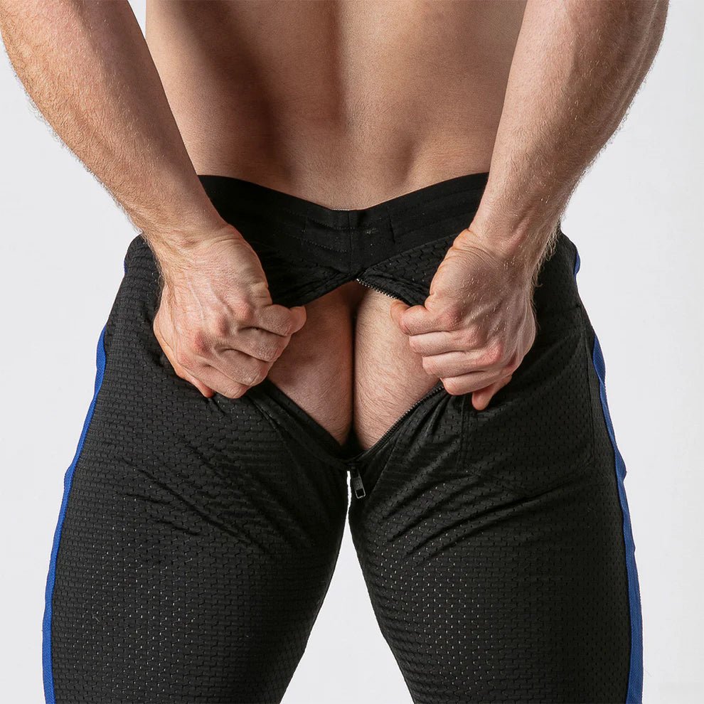 Keep cool and look hot in the Locker Gear Sport Mesh Back Zip Jogger Blue! Ultra-practical sportswear gives you added fetish flair with a mesh fabric and cheeky unzippable glory hole.