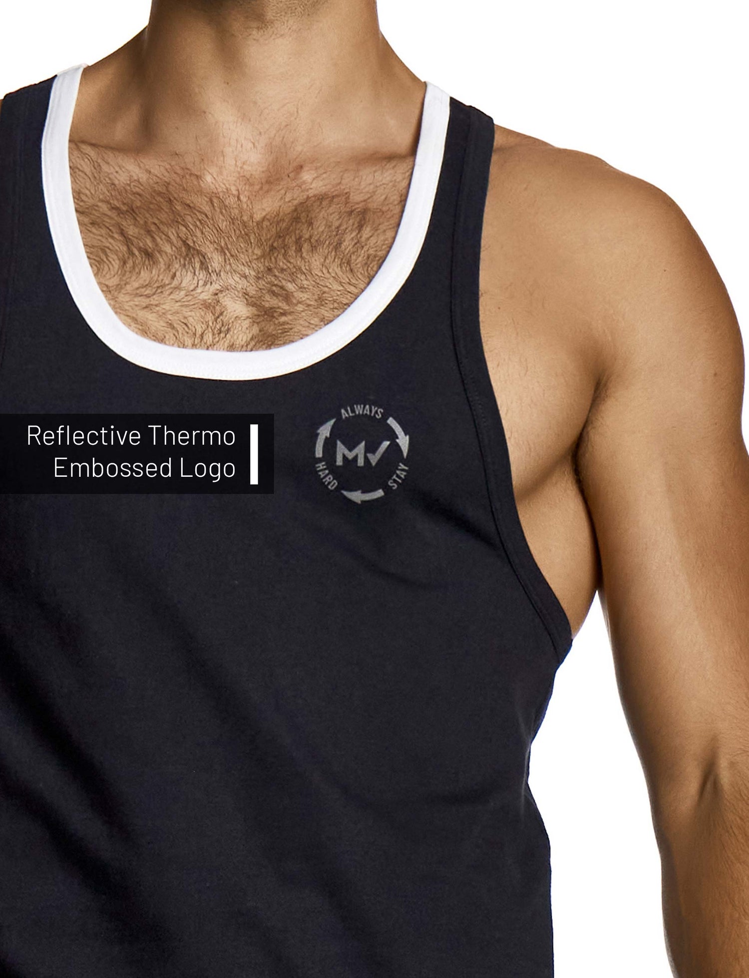 Look and feel your sexy best in a new high quality Modus Vivendi Athletic Tank Top Black. Built with pure cotton knit, it's feather-light yet incredibly soft against your skin. The signature thermo-embossed reflective logo catches the eye, while the distinctive V-back line and contrast trim add a modern edge. Whether you're hitting the gym or grabbing coffee, this versatile piece transitions seamlessly from workout to weekend. Built for athletes, designed for everyone.