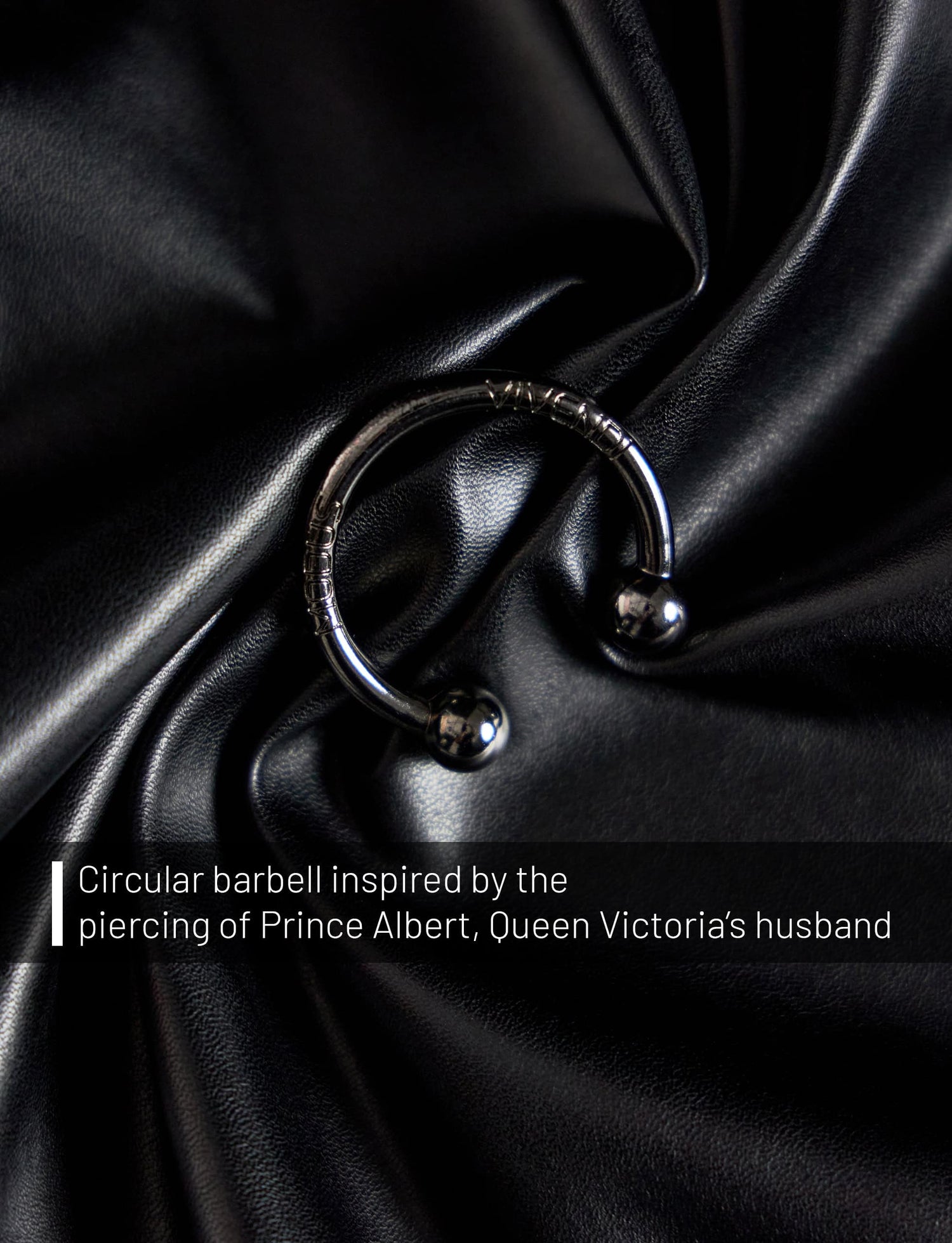 Turn heads with the most unique collection around - the Prince Albert collection. Crafted from supple leather blended with breathable modern fabrics, it delivers edgy leather-like sophistication without sacrificing comfort. The signature circular metal barbell detail pays homage to a provocative legacy of the most erotic of male piercings,