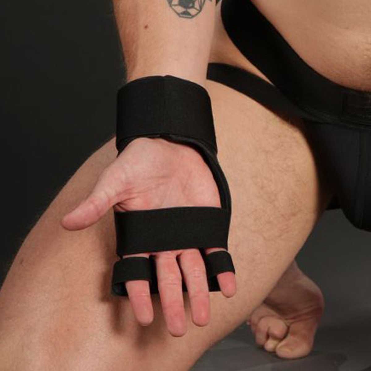 The left side is marked with an L tag. When putting on the glove on your index finger should go into the loop of the slightly curved panel on the left. Your little finger then goes into the elastic loop on the right-hand side. Wrap the elastic wrist strap around twice and secure it with the Velcro loops. Then repeat the process for the right side, using your index finger on the right and little finger on the left.