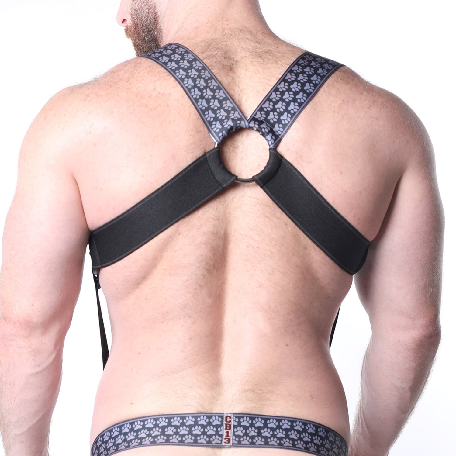The Cellblock 13 Muzzle Up Elastic Harness Grey offers exceptional stretch and support with wide logo elastic straps that frame the chest and back. Featuring pliable rubber rings and a sturdy metal O-ring at the center back, it ensures durability and style, and a place for a leash? Fully adjustable side straps clip onto your favorite jock or brief, allowing for a complete look. For something more streamlined, simply snap off the lower straps to wear it as a bulldog harness alone. Harness and briefs are sold separately, providing customizable options for your newest paw-fect outfit!