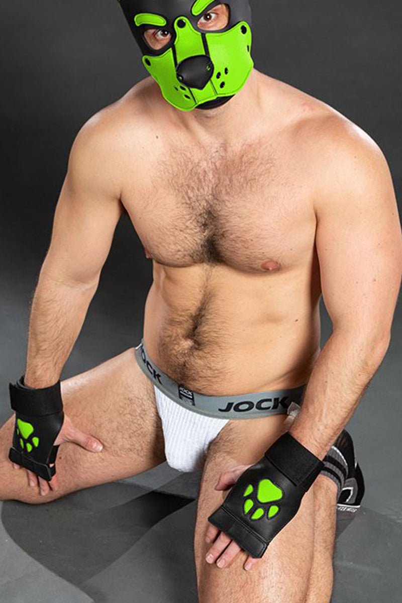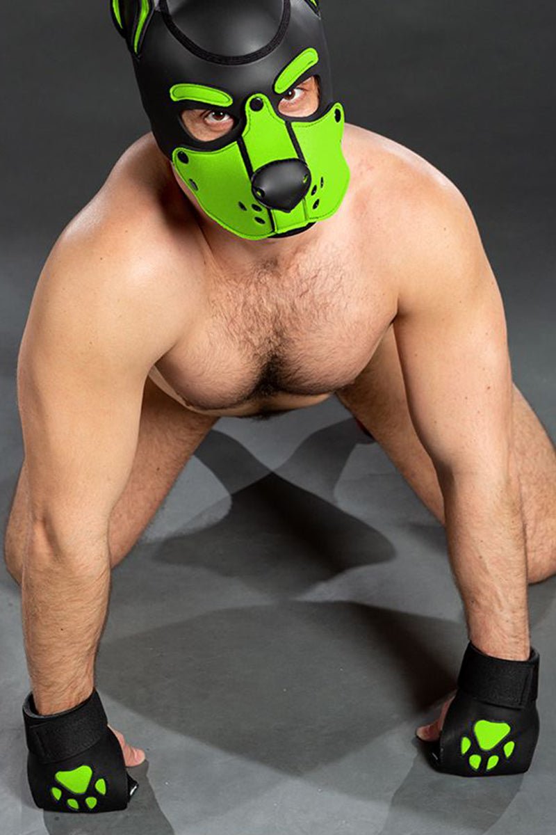 The guys at Mr S Leather’s Puppy Department have been working hard on a new version of their puppy mitts. We are proud to include them in our exciting range of pup gear. Introducing the Open Paw Puppy Glove with lime paw print motif!