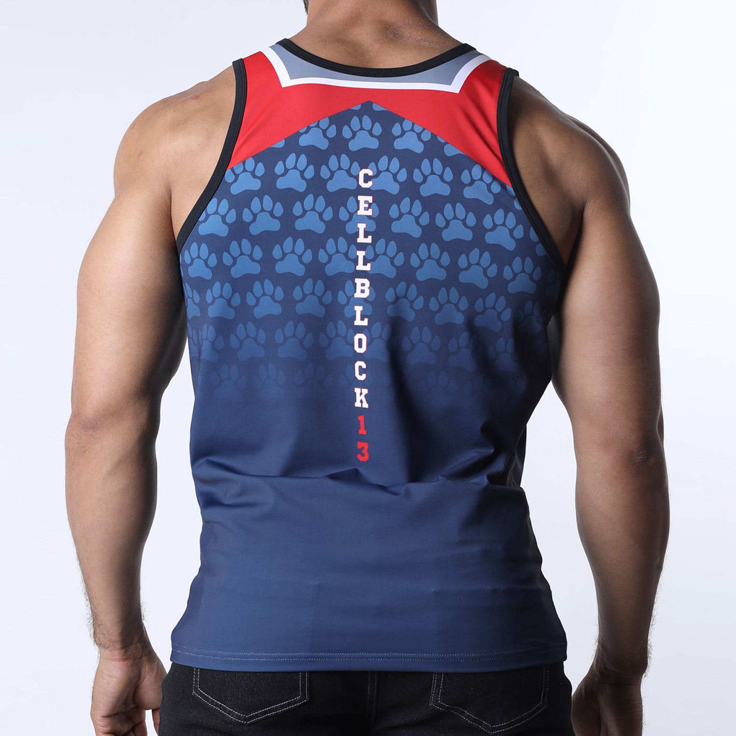 The CellBlock13 Muzzle Up Tank Top Blue offers a sleek, muscle-hugging fit crafted from smooth polyester/spandex for comfort and flexibility. Puppy paw prints enhance the design, while the bold puppy face on the front make a confident statement to all who ask. Ideal for play parties, pride events, or casual walks in the park, this tank top combines style and function for handlers and pups alike.