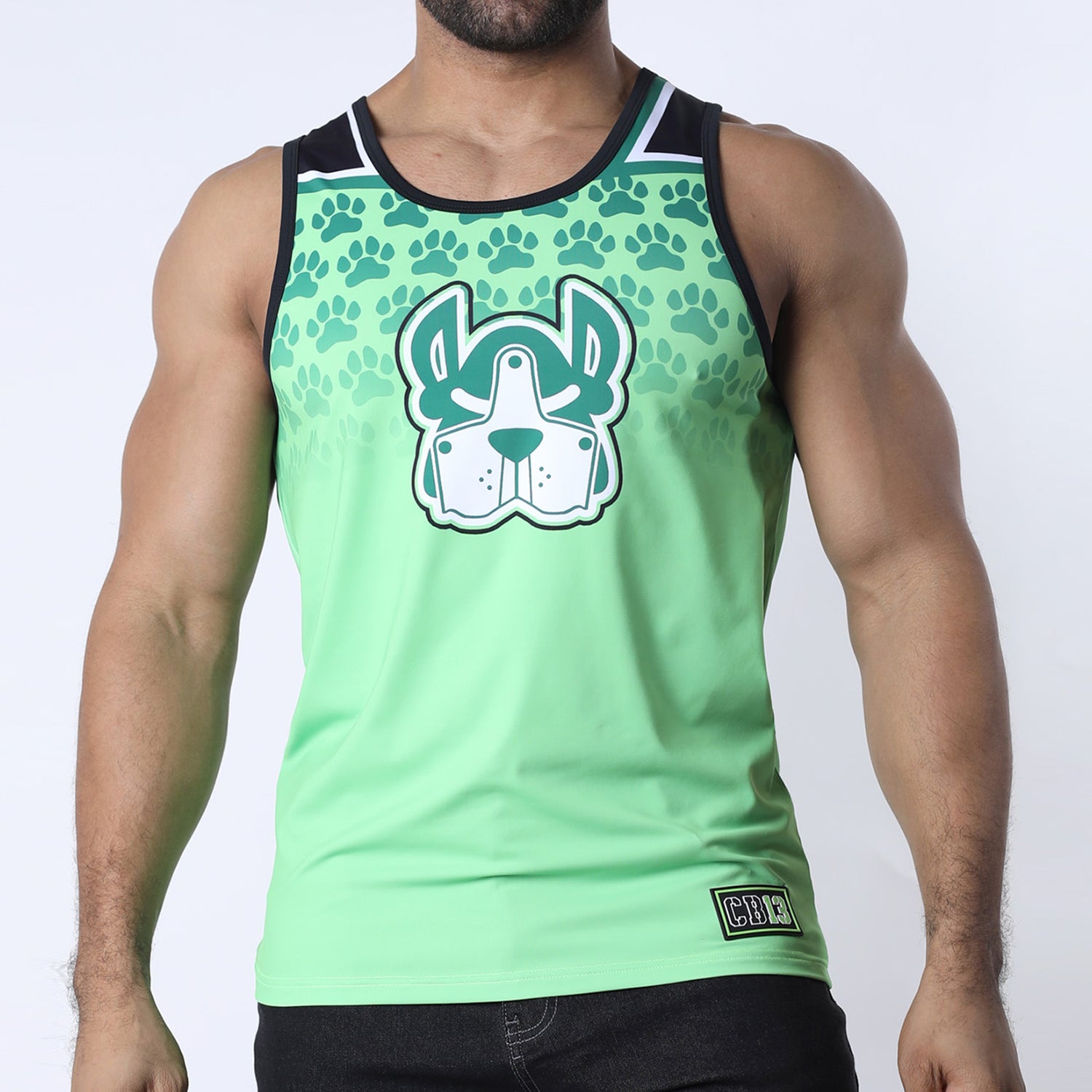 The CellBlock13 Muzzle Up Tank Top Green offers a sleek, muscle-hugging fit crafted from smooth polyester/spandex for comfort and flexibility. Puppy paw prints enhance the design, while the bold puppy face on the front make a confident statement to all who ask. Ideal for play parties, pride events, or casual walks in the park, this tank top combines style and function for handlers and pups alike.