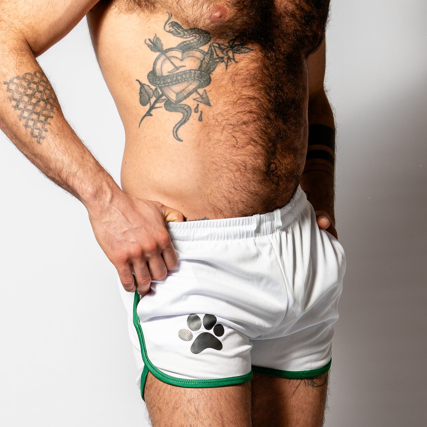 Look your sporty best in a new pair of PWR Pup Mesh Paw Print Short White Green.