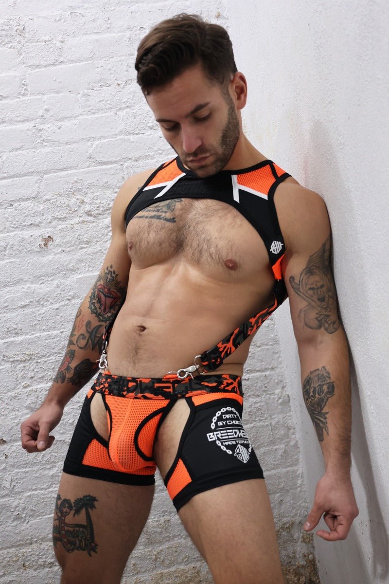 Seemless, cutting edge gear design can be found in the Breedwell Neo Camo Tank Harness Neon Orange. The tank panel covers your upper chest and back with unique fleshmesh fabrics, that are breathable yet super hot.