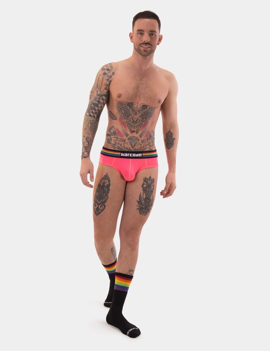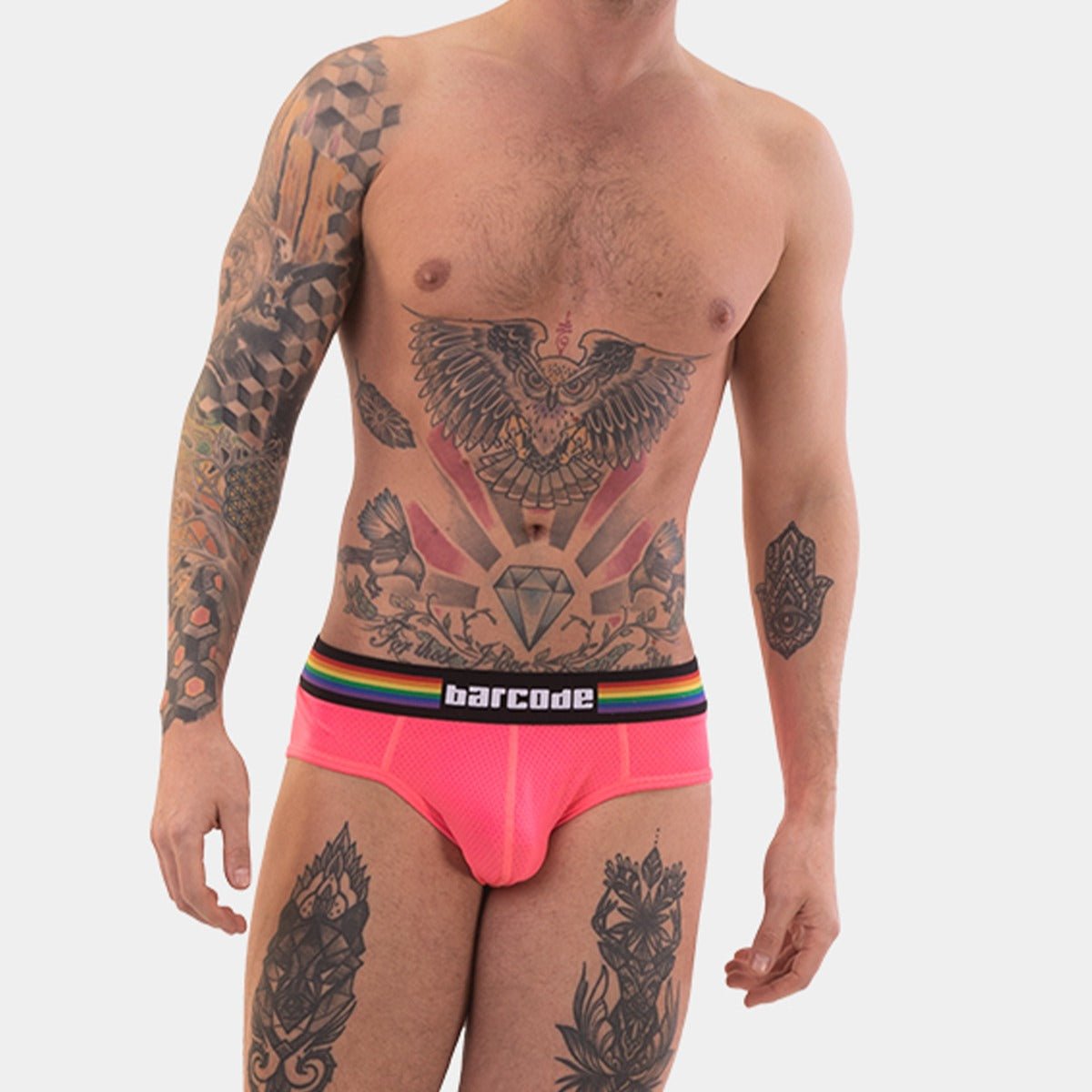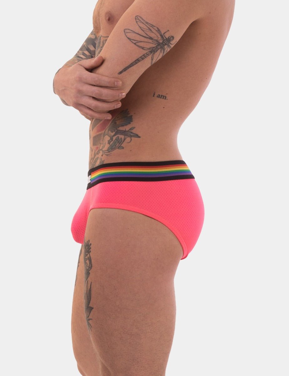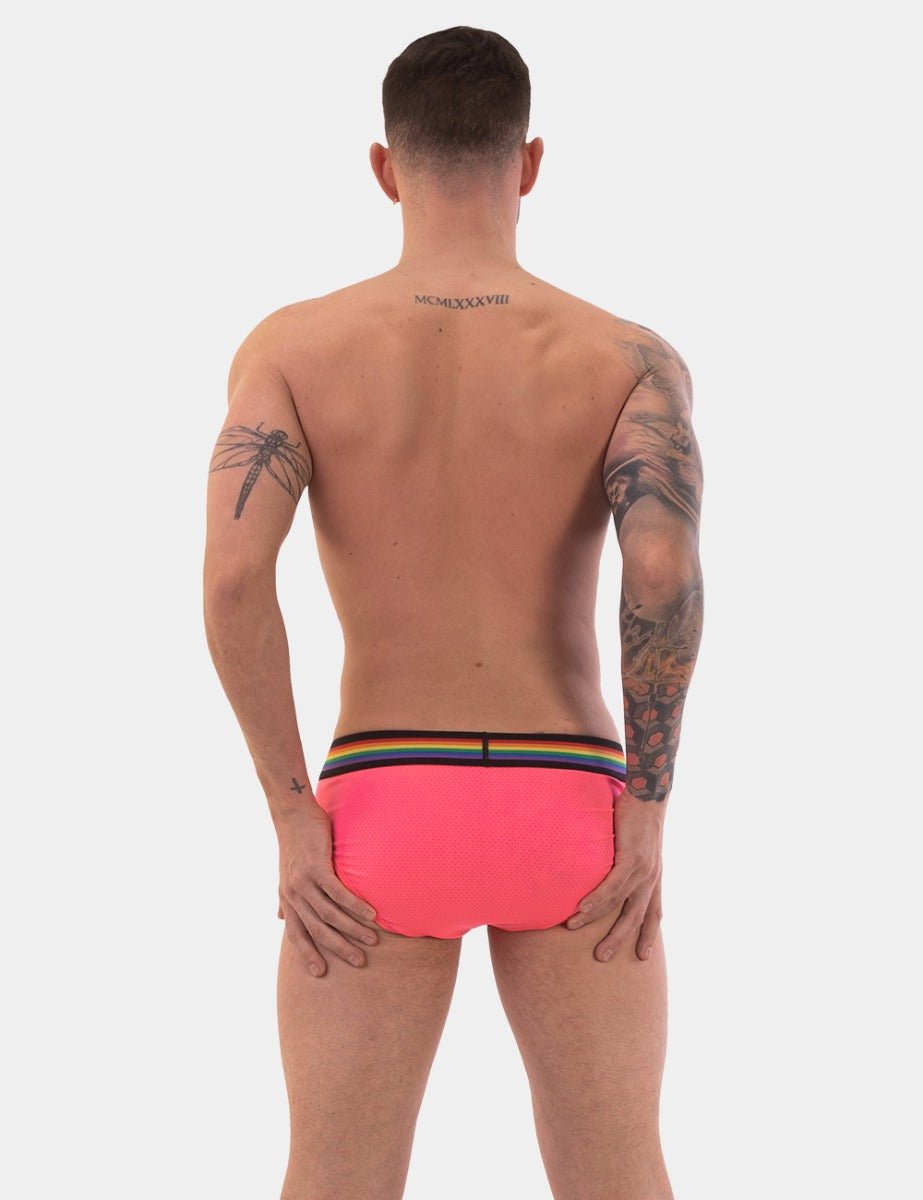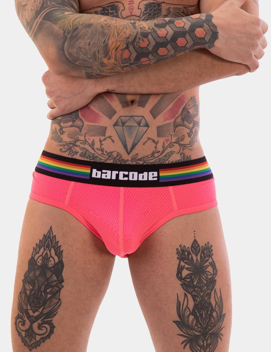 The Barcode Berlin Pride Brief Neon Pink is ideal step out feeling loud, comfortable and proud! Sizzle up your summer in vibrant neon underwear with a pride rainbow waistband.