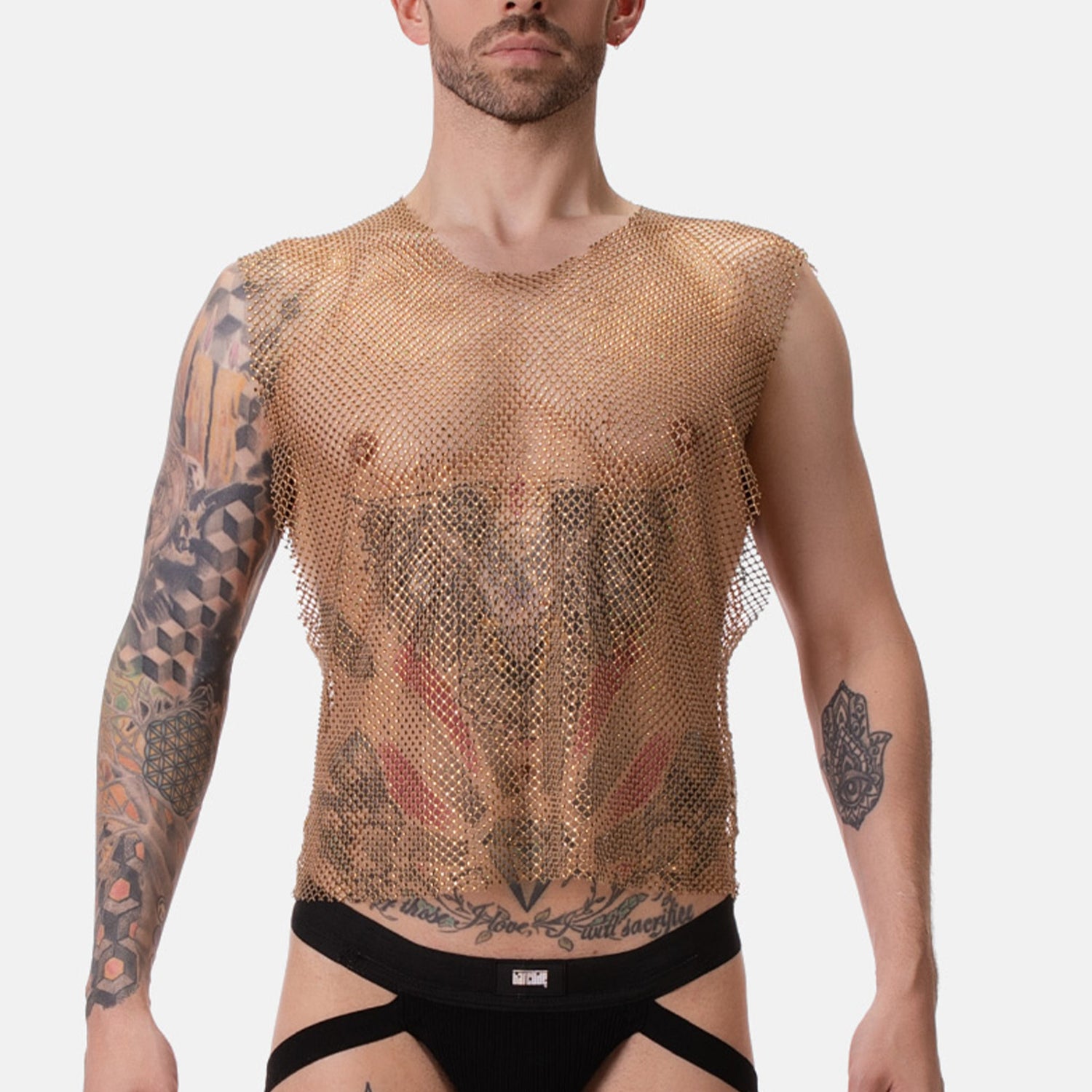 Transparent, lightweight mesh material sits perfectly over your bare chest or favourite harness to show everyone where the goods are. Shiny, reflective rhinestones instantly light up any outfit in a perfectly breathable wardrobe piece that adds fun, sexy glamour to your wardrobe.