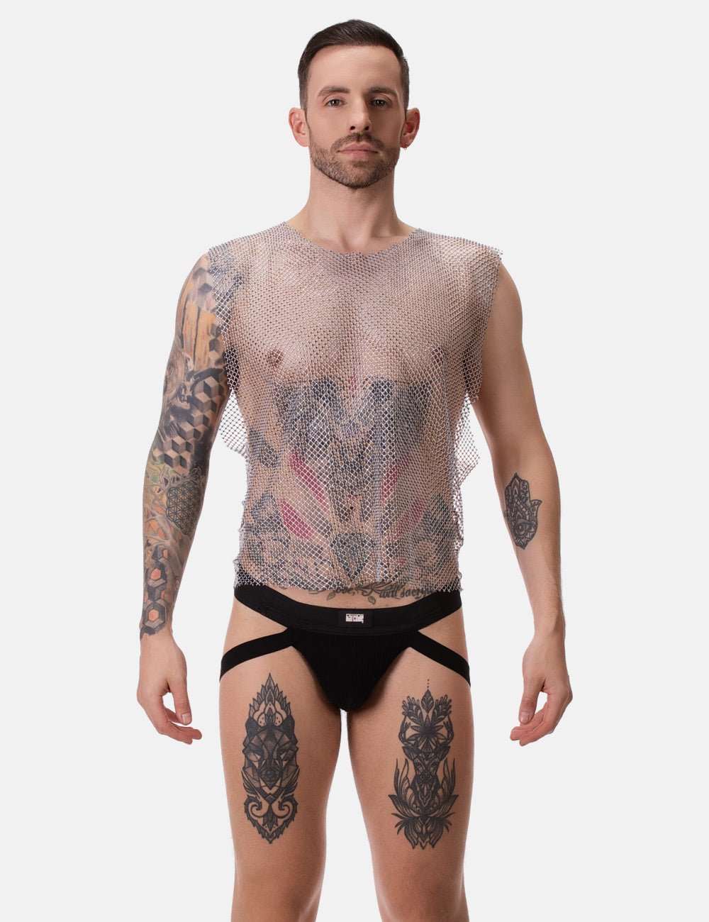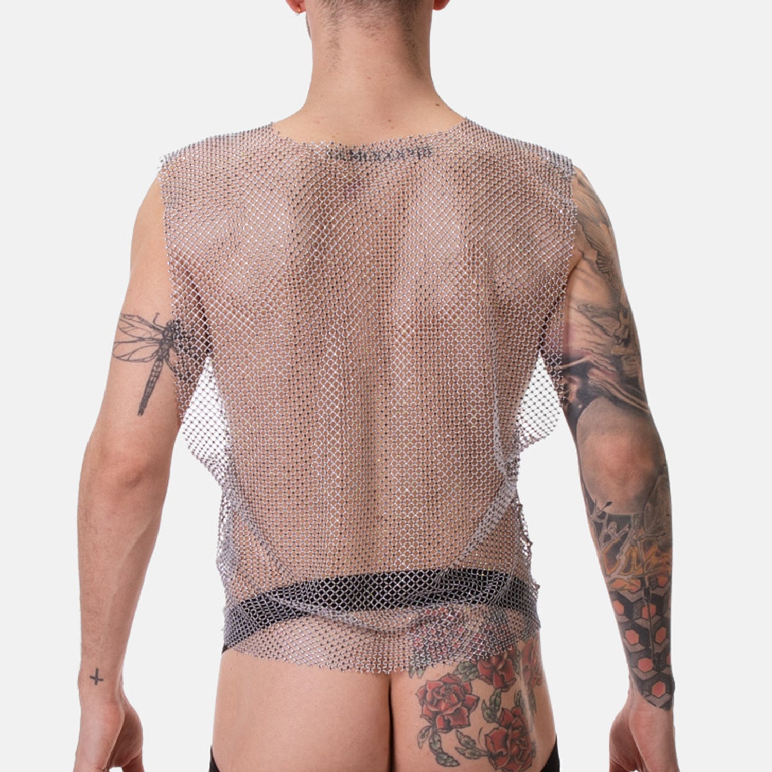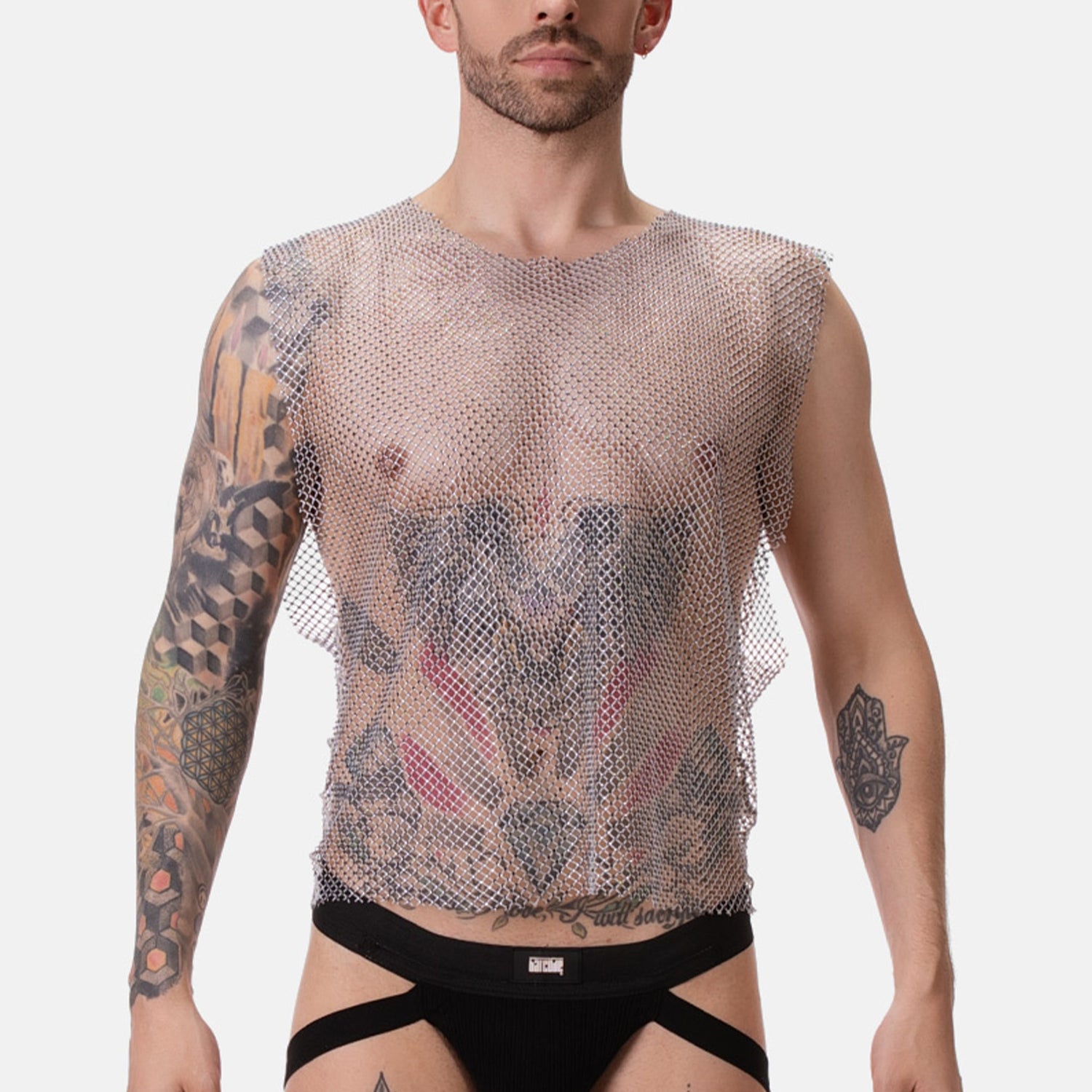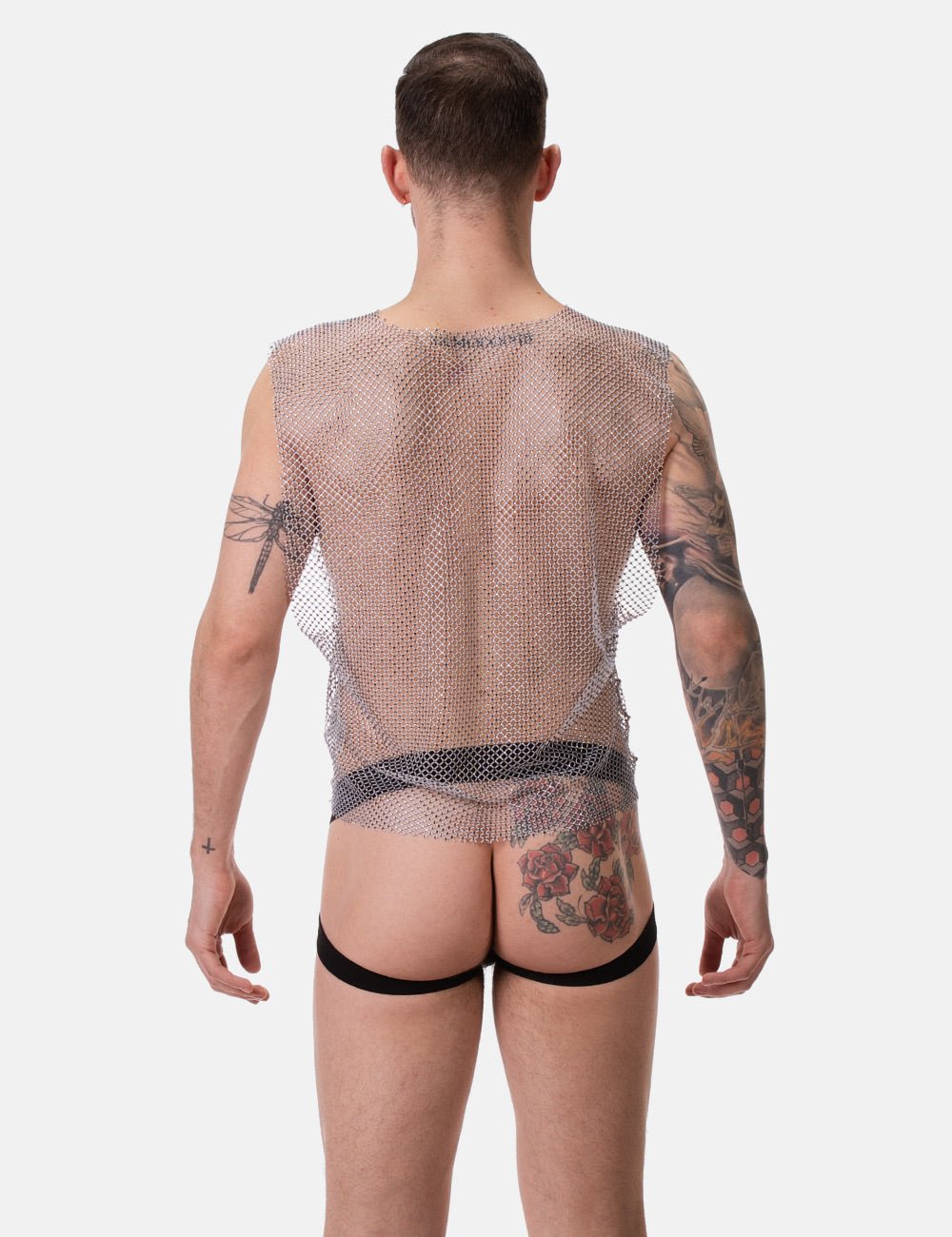 Transparent, lightweight mesh material sits perfectly over your bare chest or favourite harness to show everyone where the goods are. Shiny, reflective rhinestones instantly light up any outfit in a perfectly breathable wardrobe piece that adds fun, sexy glamour to your wardrobe.
