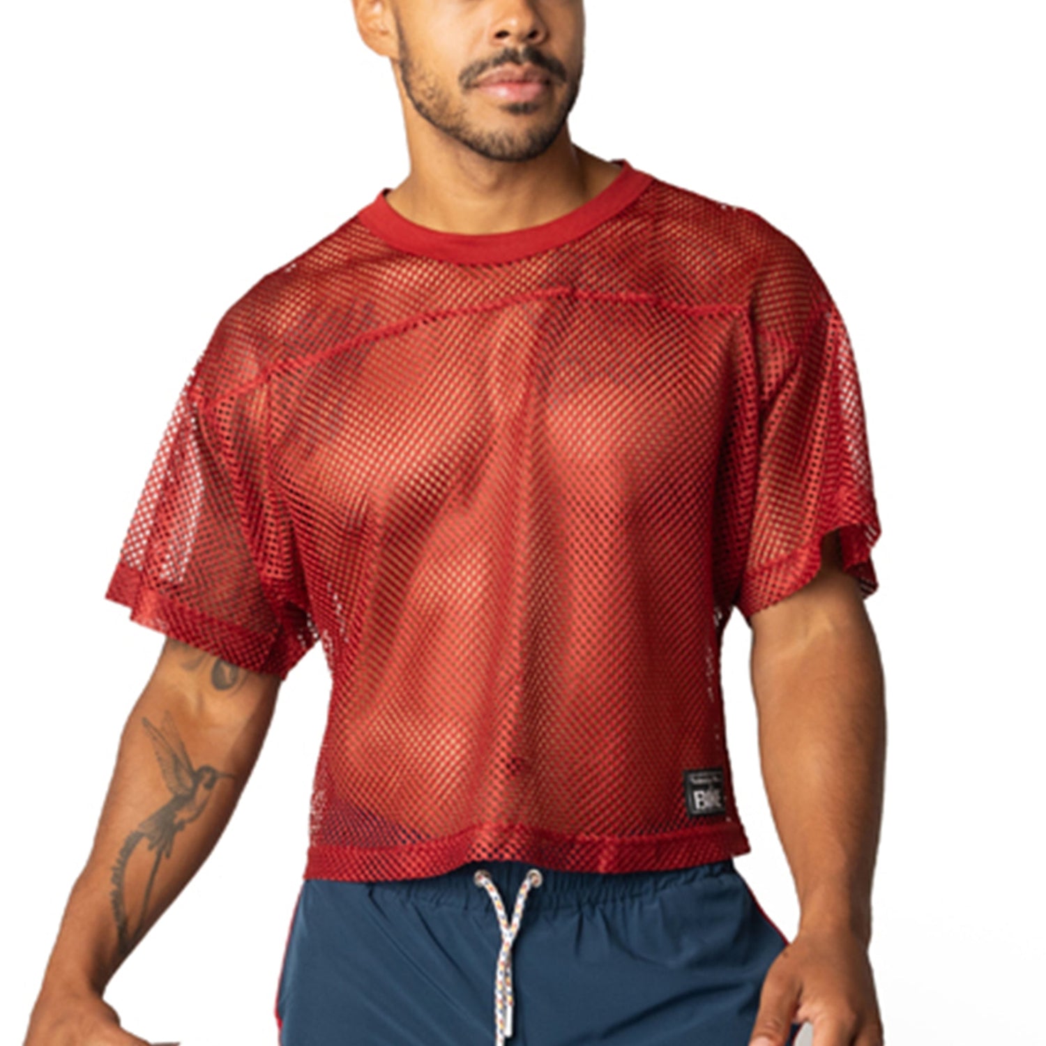 Made of semi transparent mesh for a soft fetish look in an athletic cut, this distinctive jersey design brings you the best of both worlds. Tasteful seams across the chest and around the collar finish this shirt in vintage locker room style, while the tease of your body underneath the light, breathable fabric hints at your naughty side.