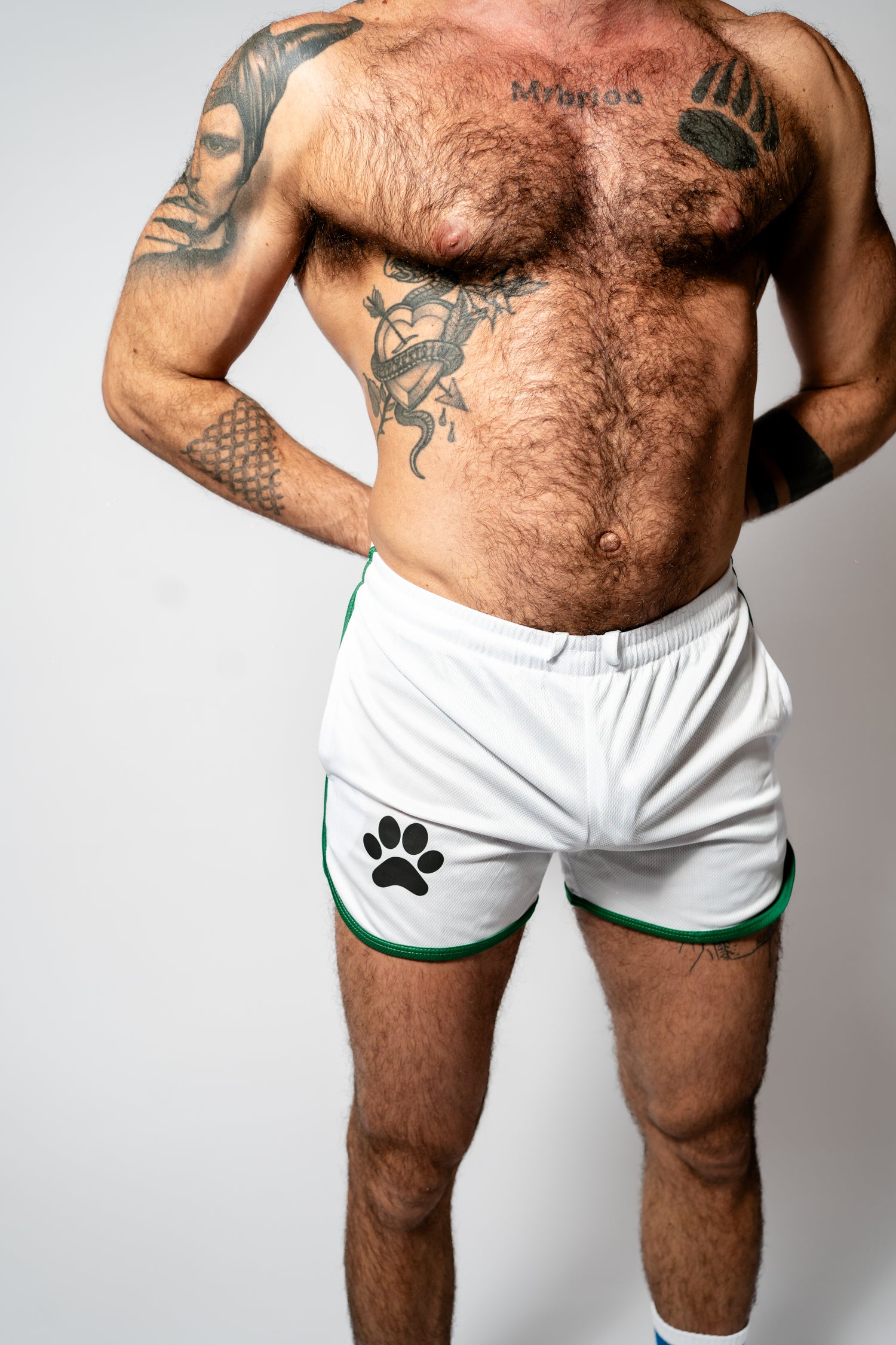 Look your sporty best in a new pair of PWR Pup Mesh Paw Print Short White Green.