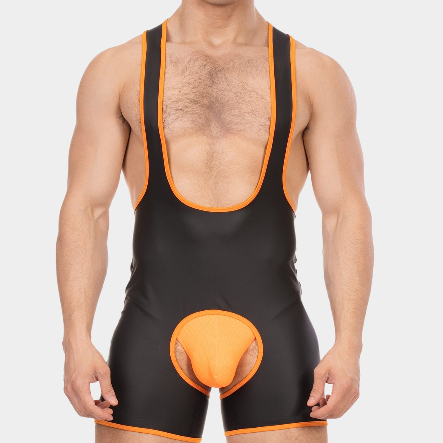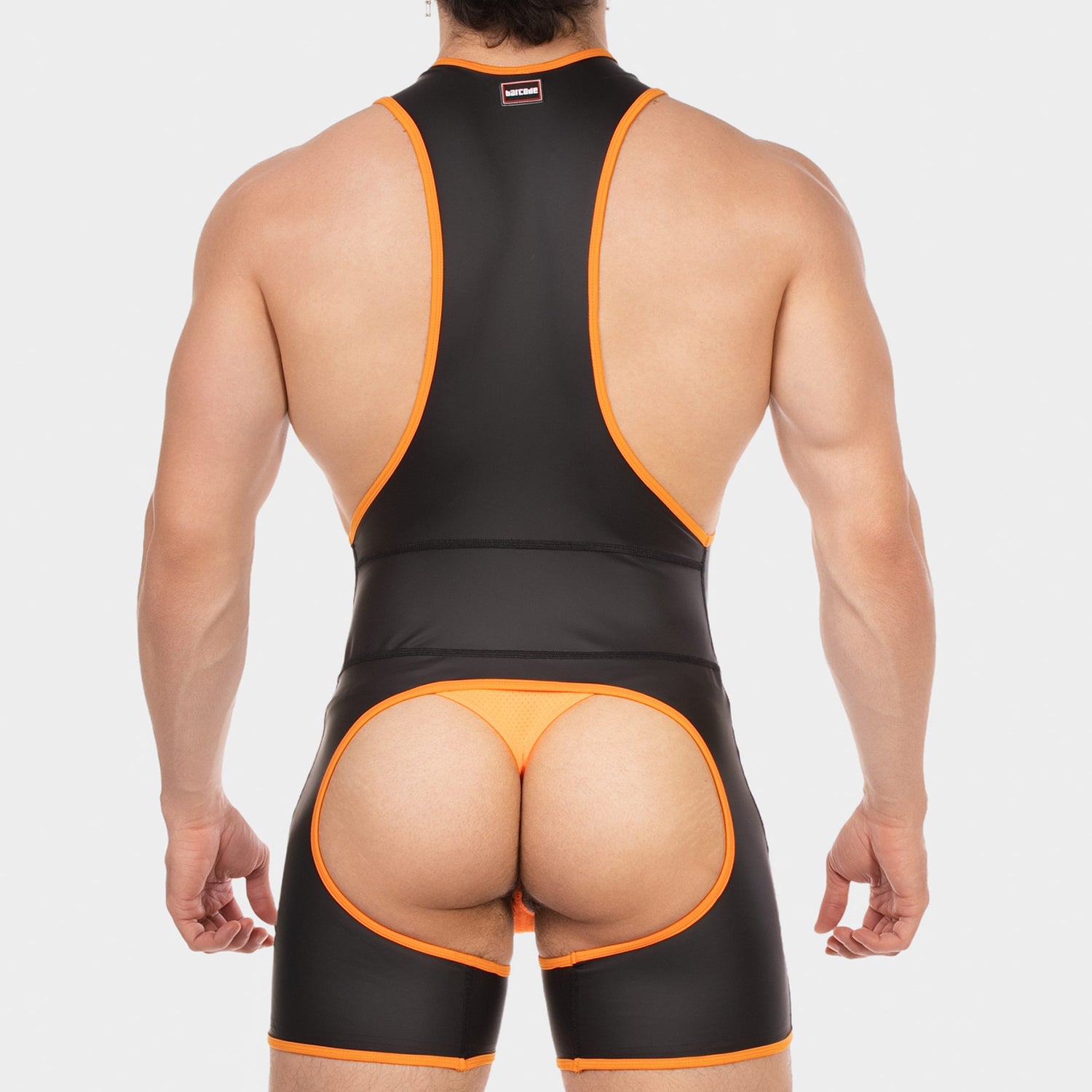 This naughty Barcode Berlin Singlet Kam Black Neon Orange combines bold design with a sleek fit. Crafted from leather imitation, it hugs your body like a wrestling-style bodysuit with striking contrast rims.