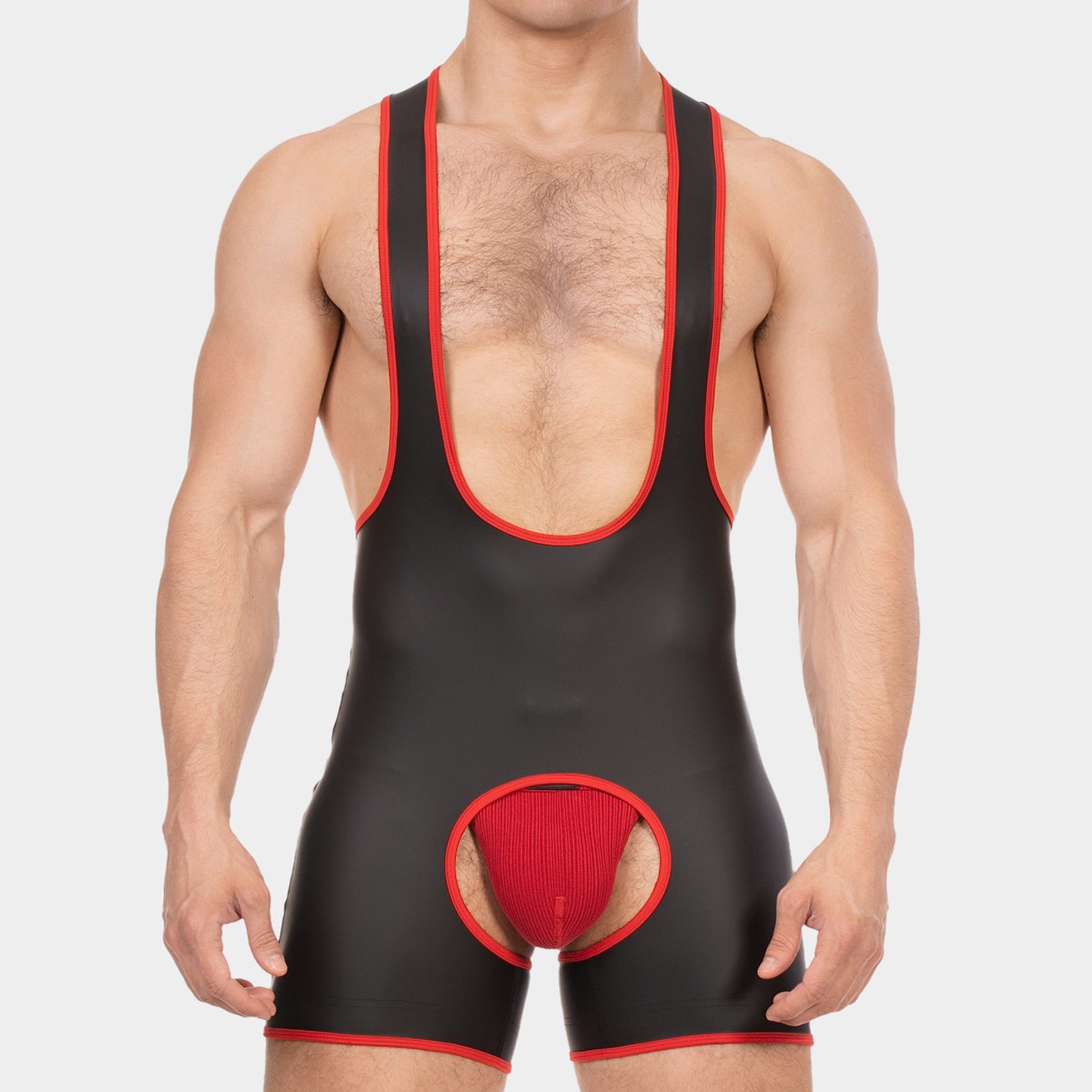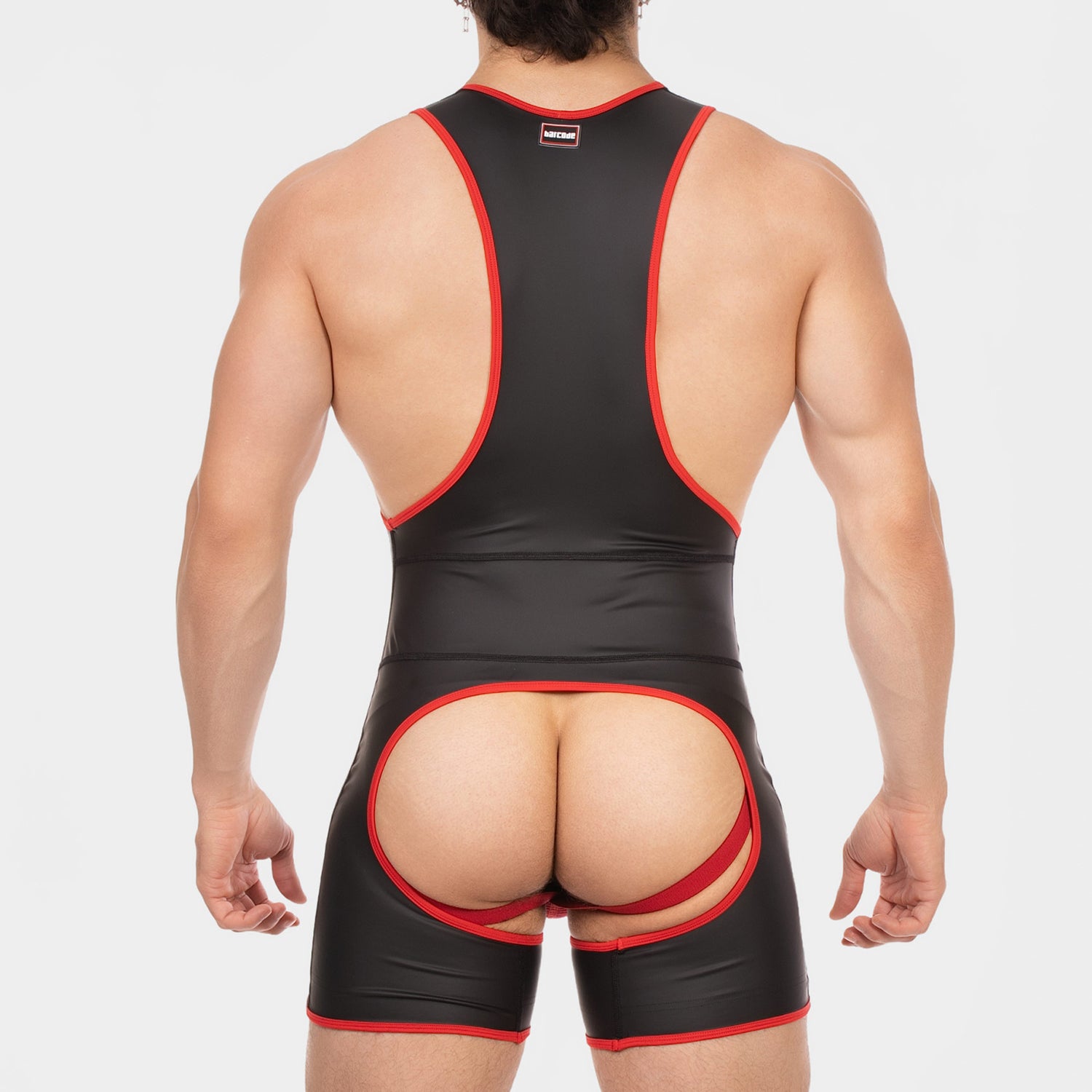 This naughty Barcode Berlin Singlet Kam Black Red combines bold design with a sleek fit. Crafted from leather imitation, it hugs your body like a wrestling-style bodysuit with striking contrast rims.