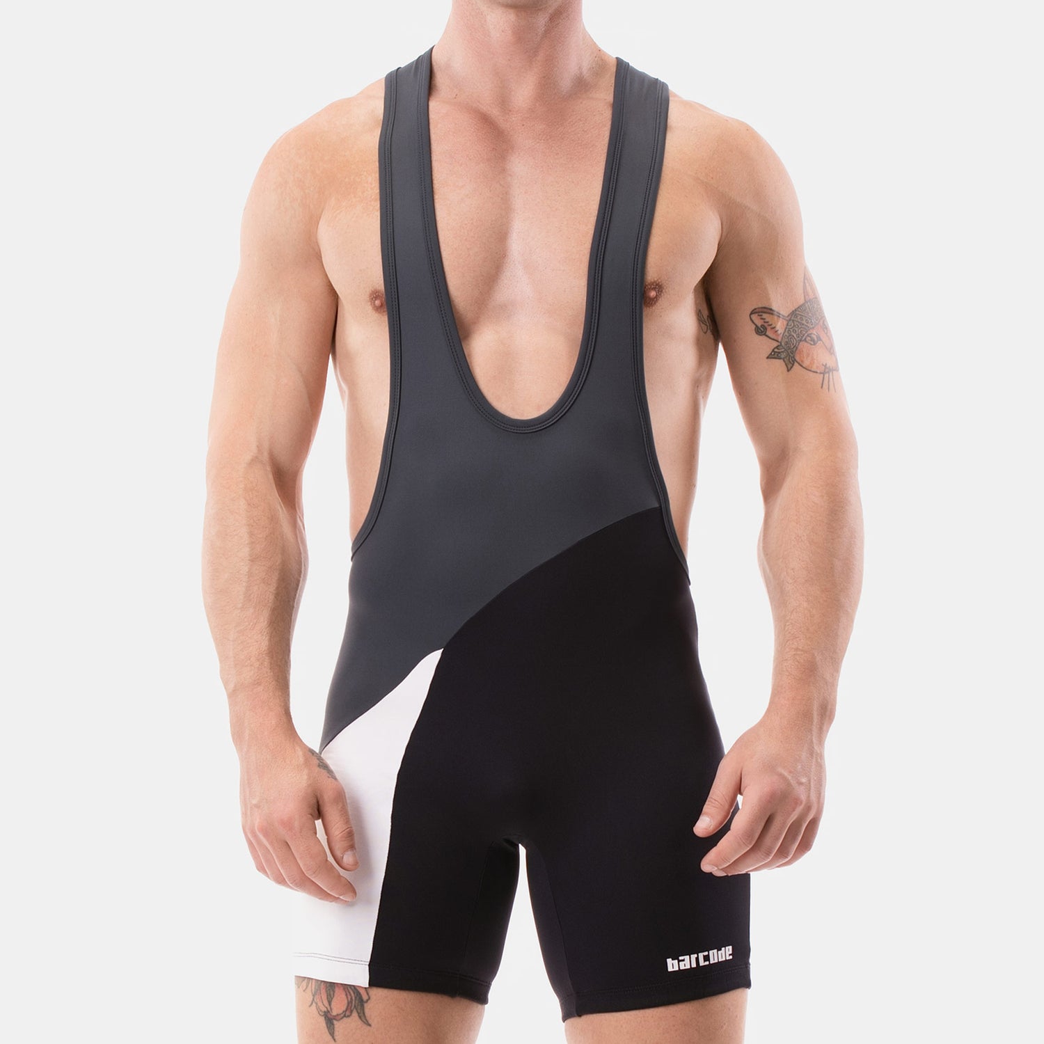 The ever-popular Barcode Berlin Singlet Luckenwalde Titanium White Black is a striking abstract designer one-piece (no zips or cut-outs) wrestling singlet. The three bright colour contrasts on this sleek sexy lightweight piece of sports gear keeps you cool when things are getting hot.