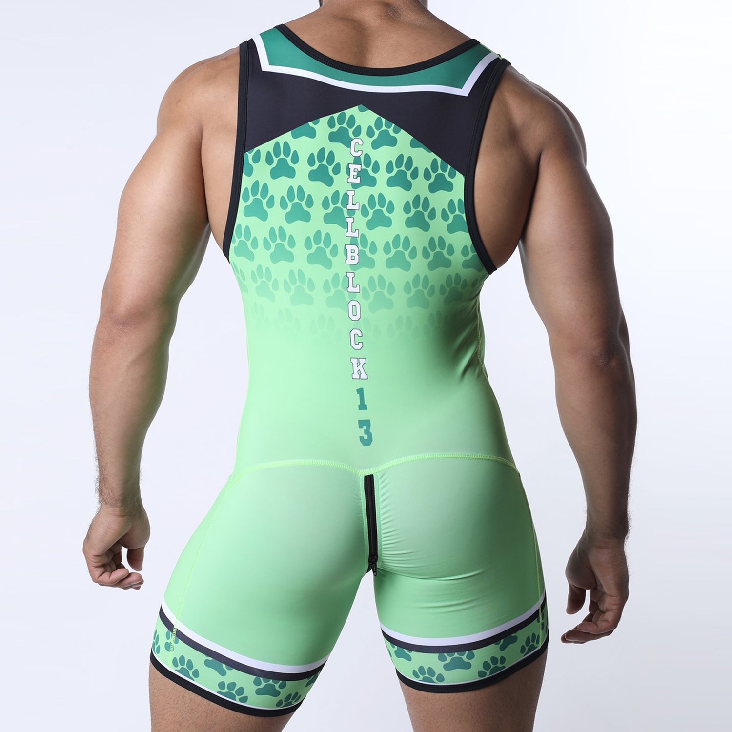 Unleash your playful puppy side with the CellBlock 13 Muzzle Up Singlet Green. Created with a stretchy fabric, it fits snugly while letting you move freely. Paw printed leg panels match the chest print and adds a striking look, and the scoop neckline keeps things nice and sporty whilst showing just enough skin! The standout feature? A full-length back zipper for easy access - perfect for those who love to present themselves without limits. Tail wagging definitely welcome!