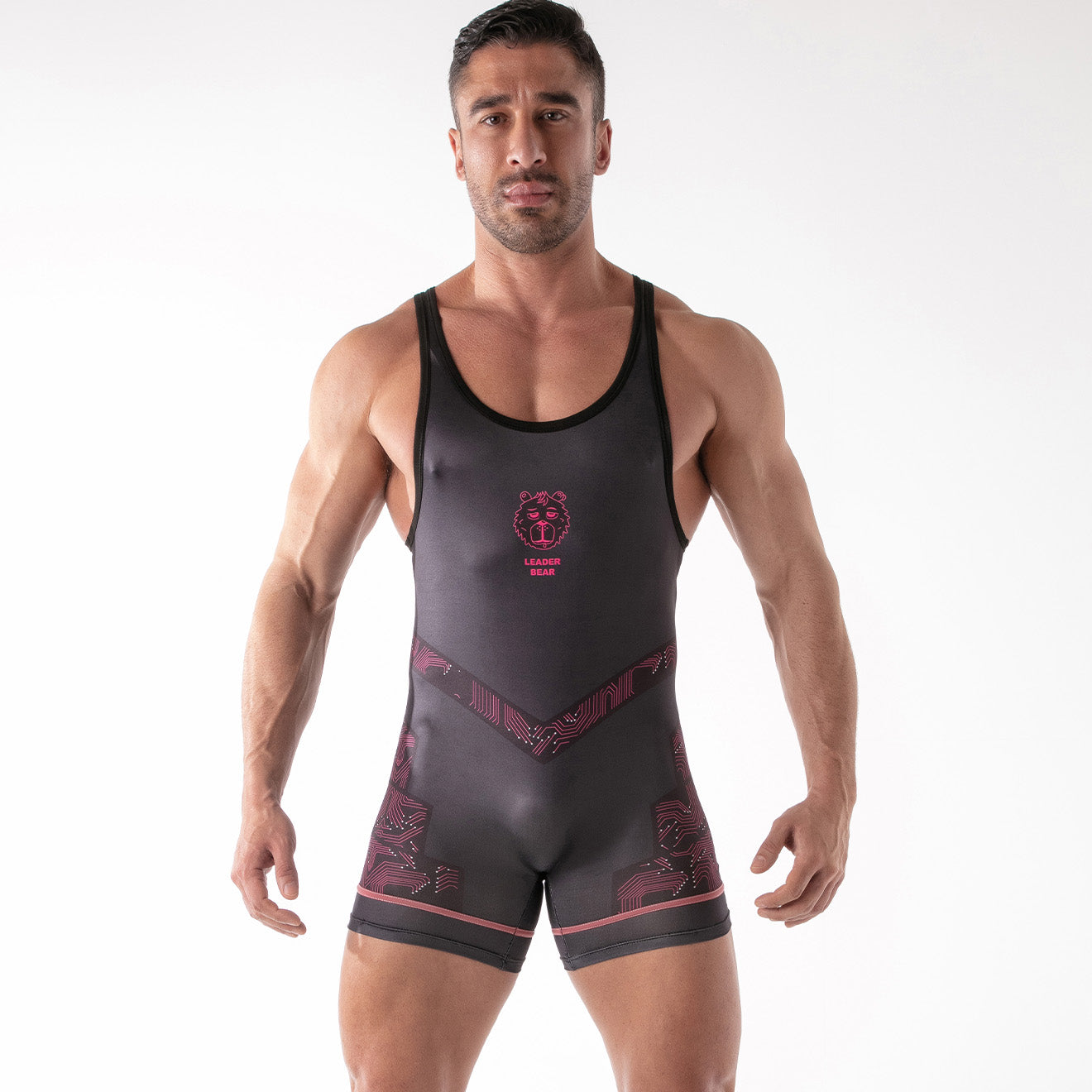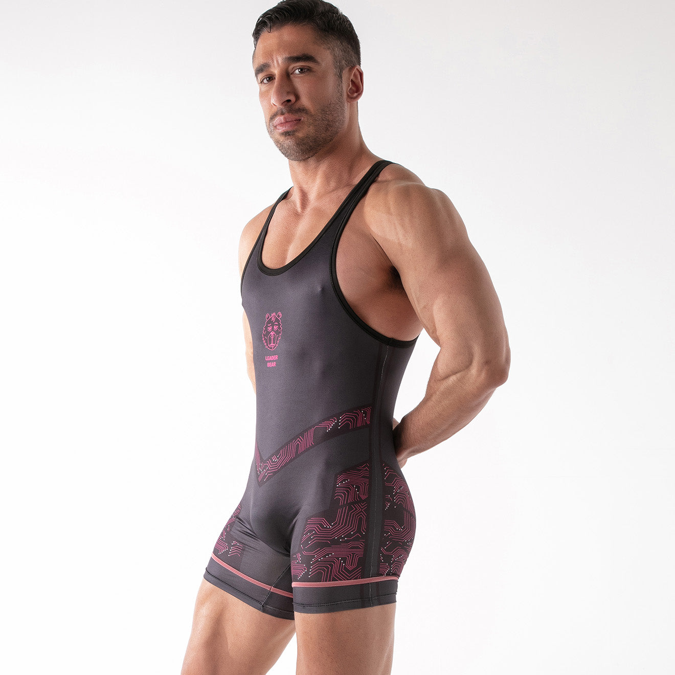 The Leader ID Party Singlet Bear Black is designed for confident nights in, and extra fun nights out. Made from stretchy black polyester, it perfectly contours your shape whilst giving you all the flex you expect. A subtle circuit board-inspired print on the lower half adds a unique addition, complemented by your chosen Identity displayed just below the chest. A discreet zip on the back offers the access you need to whip it on or off in a trice! This makes this singlet as functional as it is stylish. Perfect for those who want to stand out and stay ready for whatever the night brings.