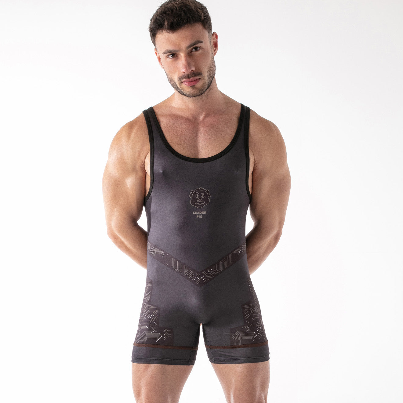 The Leader ID Party Singlet Pig Black is designed for confident nights in, and extra fun nights out. Made from stretchy black polyester, it perfectly contours your shape whilst giving you all the flex you expect. A subtle circuit board-inspired print on the lower half adds a unique addition, complemented by your chosen Identity displayed just below the chest. A discreet zip on the back offers the access you need to whip it on or off in a trice! This makes this singlet as functional as it is stylish. Perfect for those who want to stand out and stay ready for whatever the night brings.