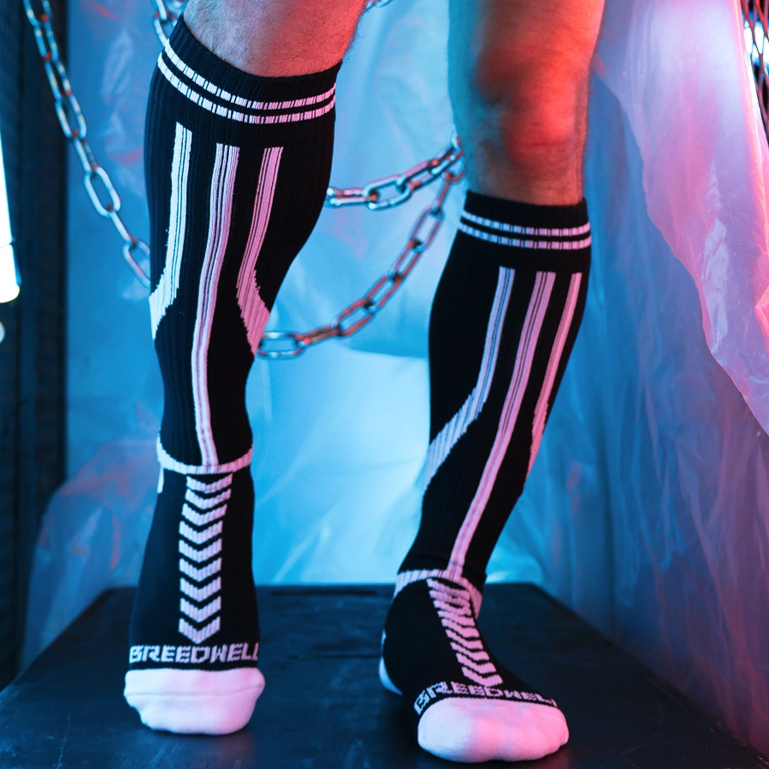 Step up your sock game with the Breedwell Sucker Socks Black. Featuring a hard to miss chevron pattern that hugs the calf and the iconic Breedwell logos on the toes, these socks add a fetishist edge to any outfit. Designed to pair perfectly with the new Circuit Breaker collection, they deliver an unmistakable statement with the daring "SUCK IT HARDER" instruction displayed on the sole. Perfect for those who want to combine style with attitude in every step.
