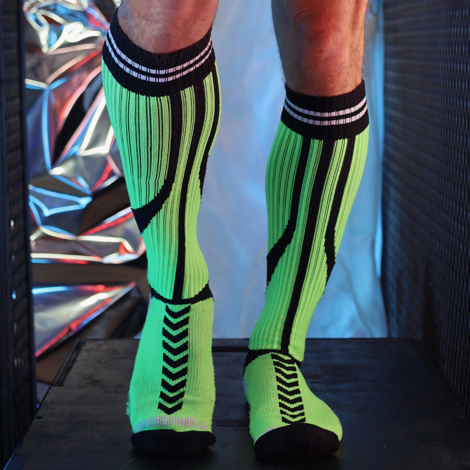 Step up your sock game with the Breedwell Sucker Socks Neon Green. Featuring a hard to miss chevron pattern that hugs the calf and the iconic Breedwell logos on the toes, these socks add a fetishist edge to any outfit. Designed to pair perfectly with the new Circuit Breaker collection, they deliver an unmistakable statement with the daring "SUCK IT HARDER" instruction displayed on the sole. Perfect for those who want to combine style with attitude in every step.