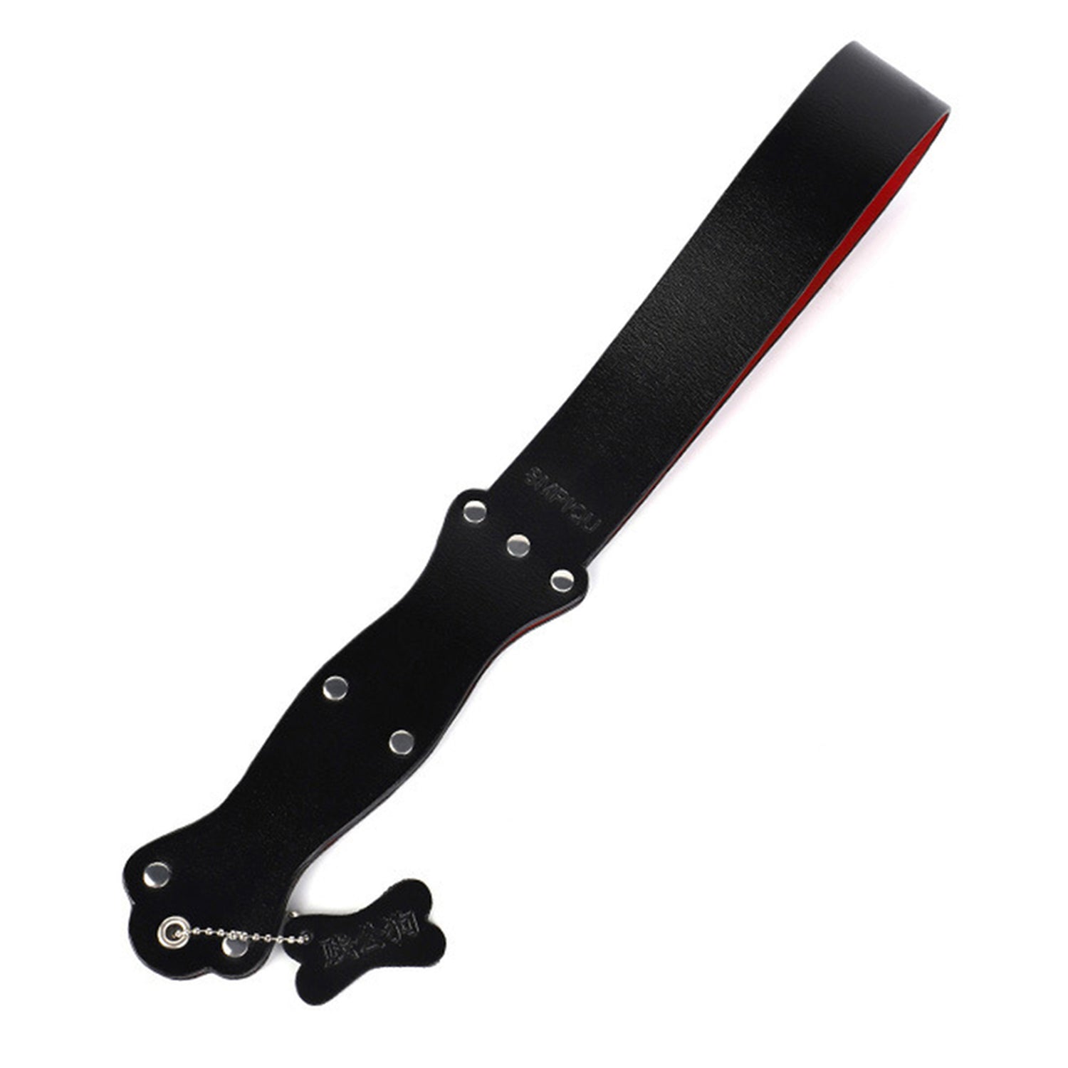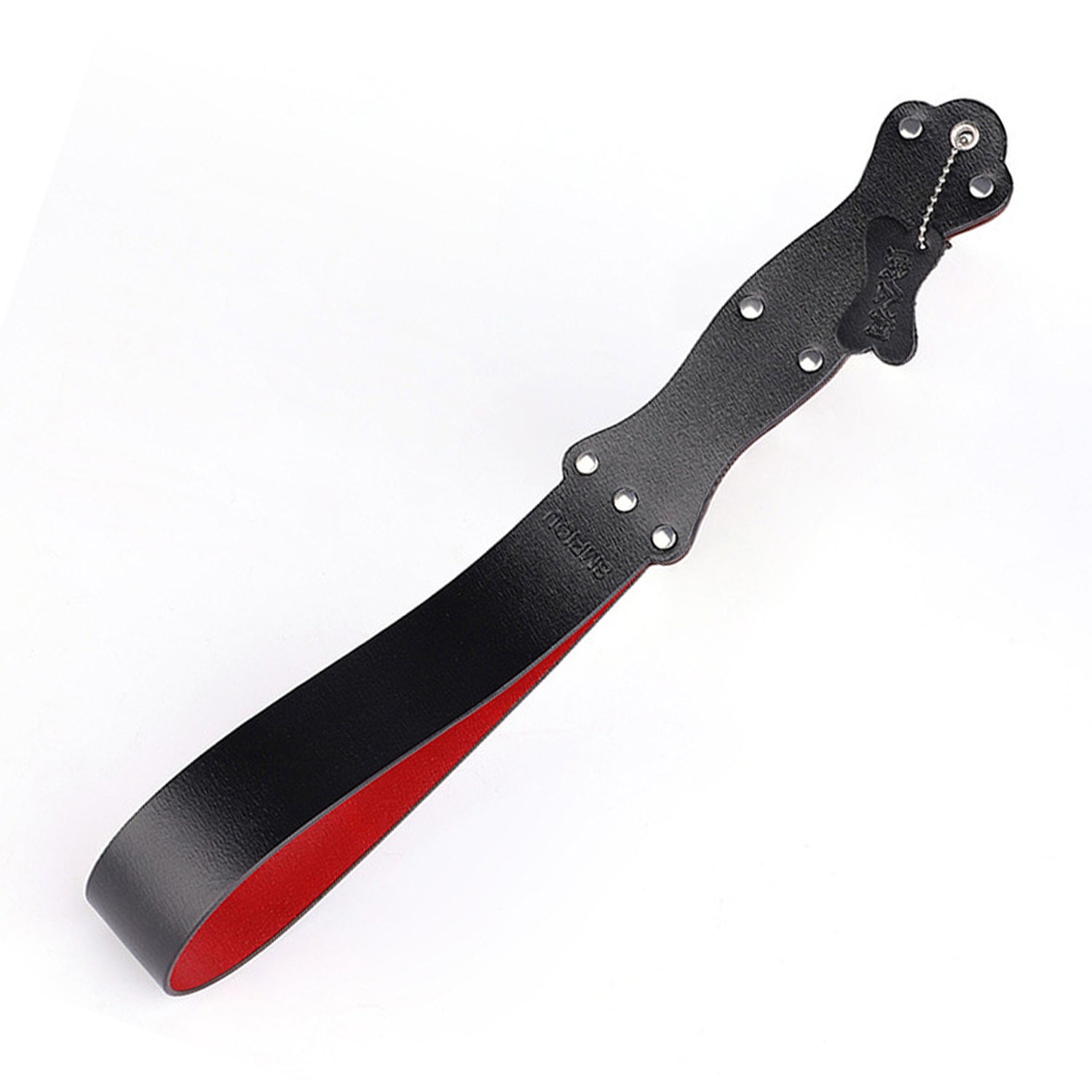 Take your playtime to the next level with our ruff GEAR Clapper Crop! This faux leather slapper and its sturdy handle with rivets provide a daring and bold experience. Red lining adds a touch of provocation. Perfect for the adventurous at heart!