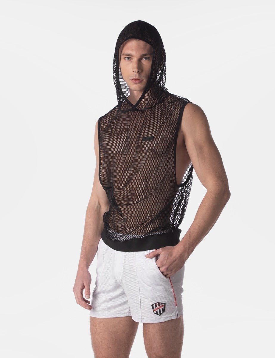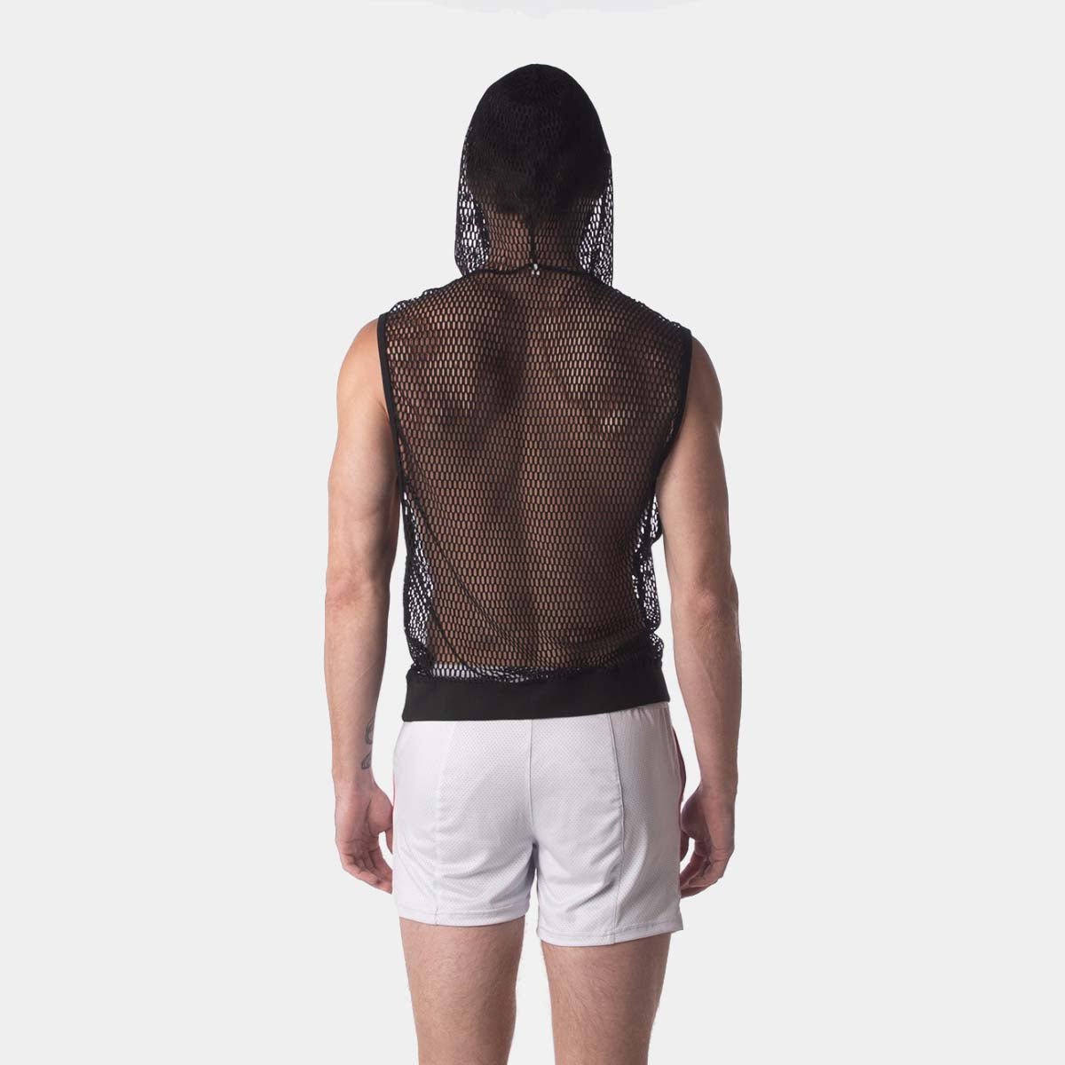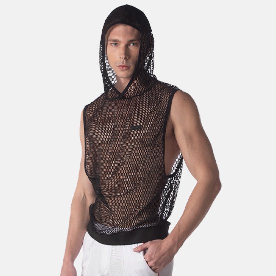 With an added hood feature, this sporty chic black mesh vest offers comfort as well as class - exactly what you're looking for when partying hard.