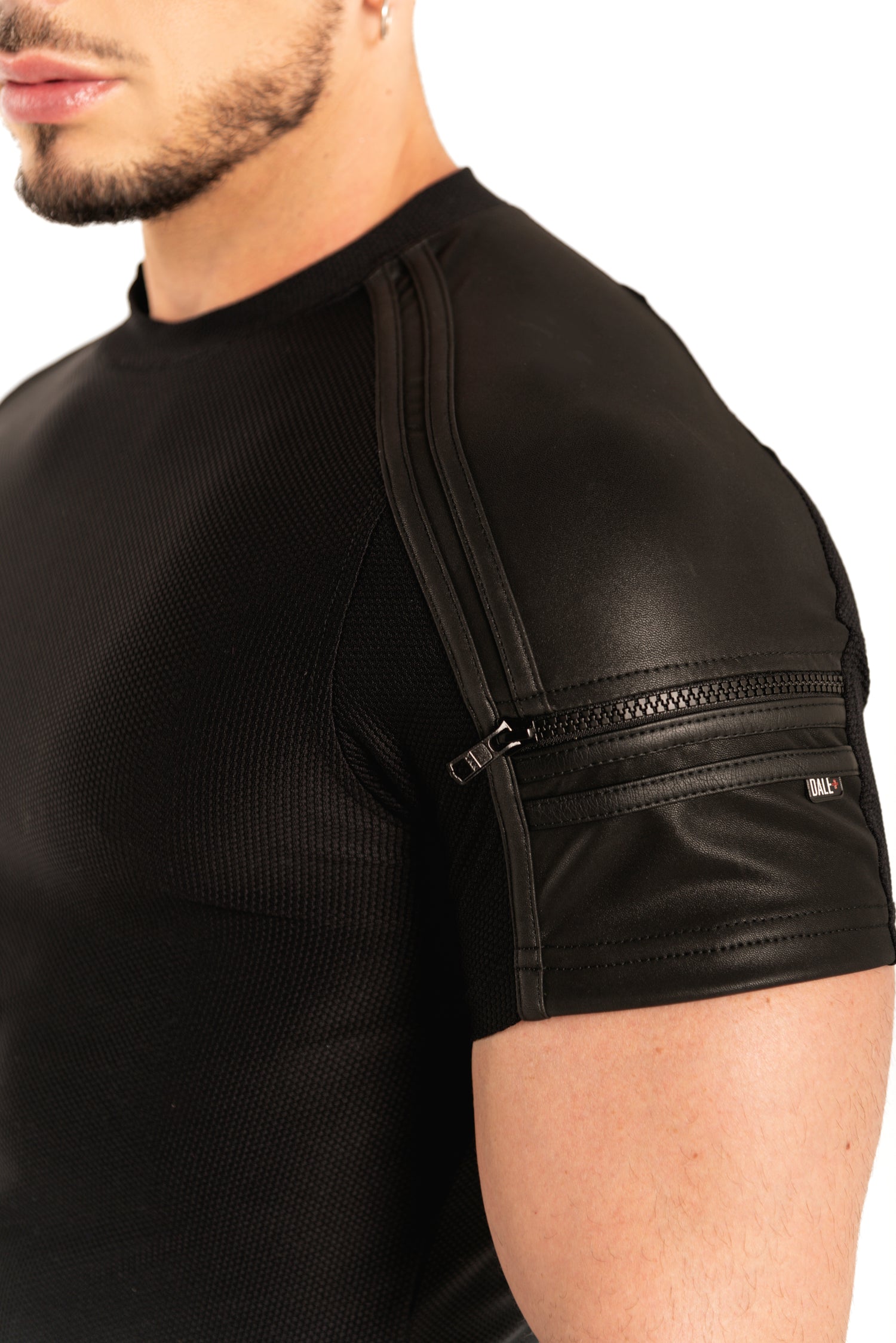 Turn heads in the Dale Mas Industrial Zipper Shirt Black, featuring a daring mesh body that teases while strong leatherette material on the shoulders add an even stronger edgy touch. Sporty contrast stripes draw attention to unique zippered pockets on the upper arms, perfect for a rebellious vibe. The stretch fabric hugs your body, creating a sleek and sexy silhouette that's impossible to ignore.