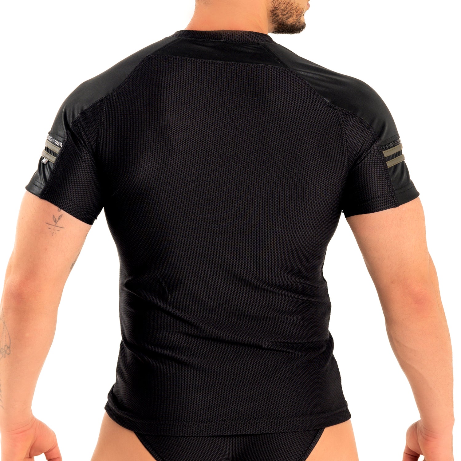 Turn heads in the Dale Mas Industrial Zipper Shirt Black Military Green, featuring a daring mesh body that teases while strong leatherette material on the shoulders add an even stronger edgy touch. Sporty contrast stripes draw attention to unique zippered pockets on the upper arms, perfect for a rebellious vibe. The stretch fabric hugs your body, creating a sleek and sexy silhouette that's impossible to ignore.