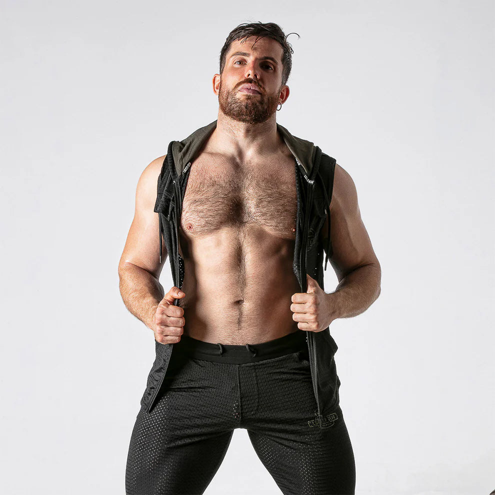 Made of the finest breathable mesh fabric, this hoody is designed to move with you. The slim-fit sleeveless design shows off your tight abs, arm muscles and shoulders, while cargo pockets on the chest and side pockets add functionality. Complete with the locker gear logo on the chest, bold contrast inner lining on the hood and side stripes in a range of fetish colours, express your individual style in a must-have hoody you’ll love wearing everywhere.