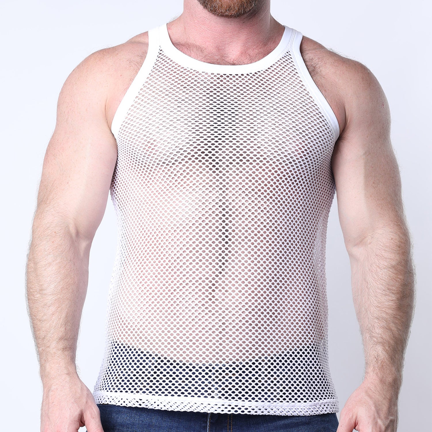 Timoteo Santorini Mesh Tank Top White - SMALL is backordered and will ship as soon as it is back in stock.