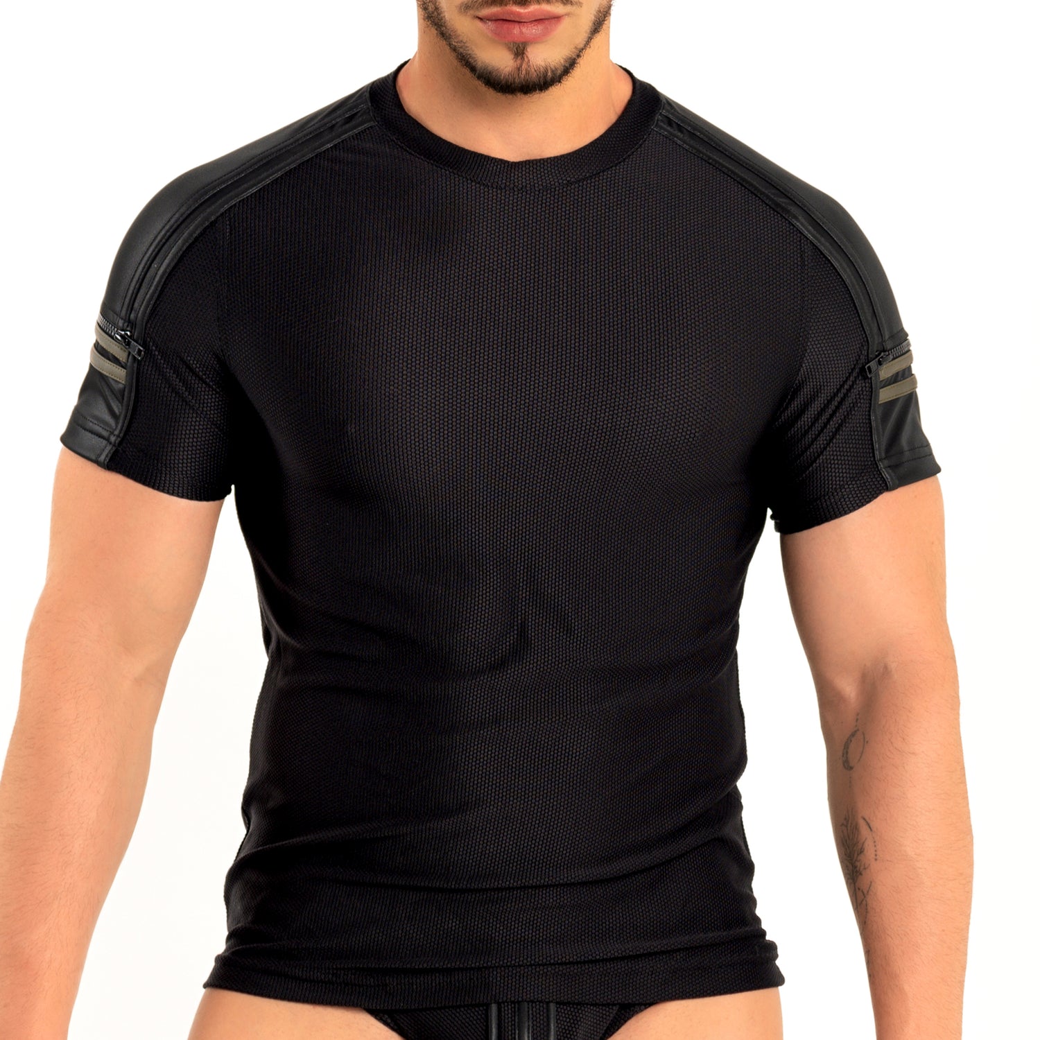 Turn heads in the Dale Mas Industrial Zipper Shirt Black Military Green, featuring a daring mesh body that teases while strong leatherette material on the shoulders add an even stronger edgy touch. Sporty contrast stripes draw attention to unique zippered pockets on the upper arms, perfect for a rebellious vibe. The stretch fabric hugs your body, creating a sleek and sexy silhouette that's impossible to ignore.