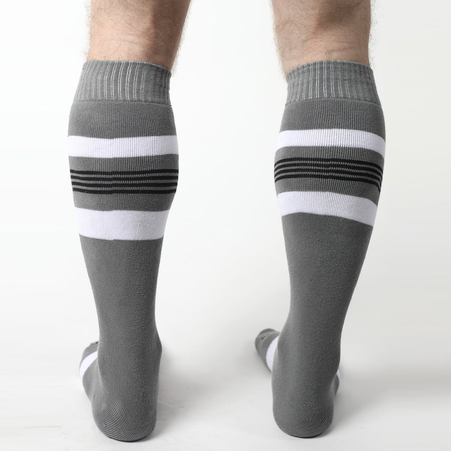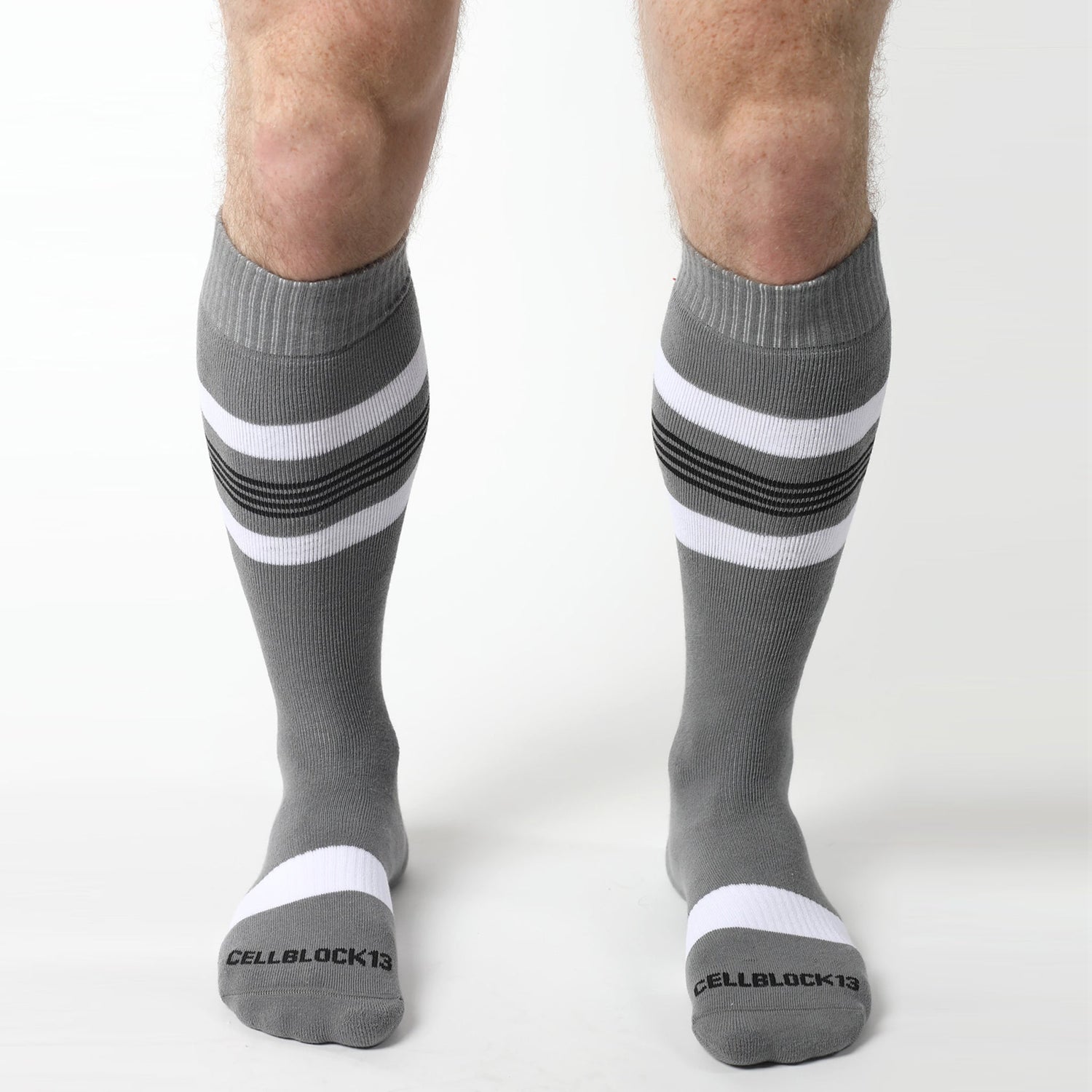 Cellblock 13 Tight End Knee High Socks Grey is backordered and will ship as soon as it is back in stock.